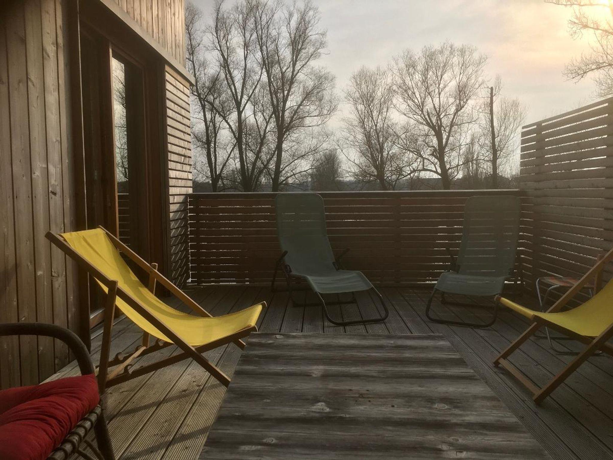 Im Sommerhalbjahr laden der überdachte Außenbereich im Erdgeschoss und die Dachterrasse im Obergeschoss bei fast jeder Wetterlage zum Aufenthalt im Freien ein. Liegestühle und Grillmöglichkeit sind vorhanden.