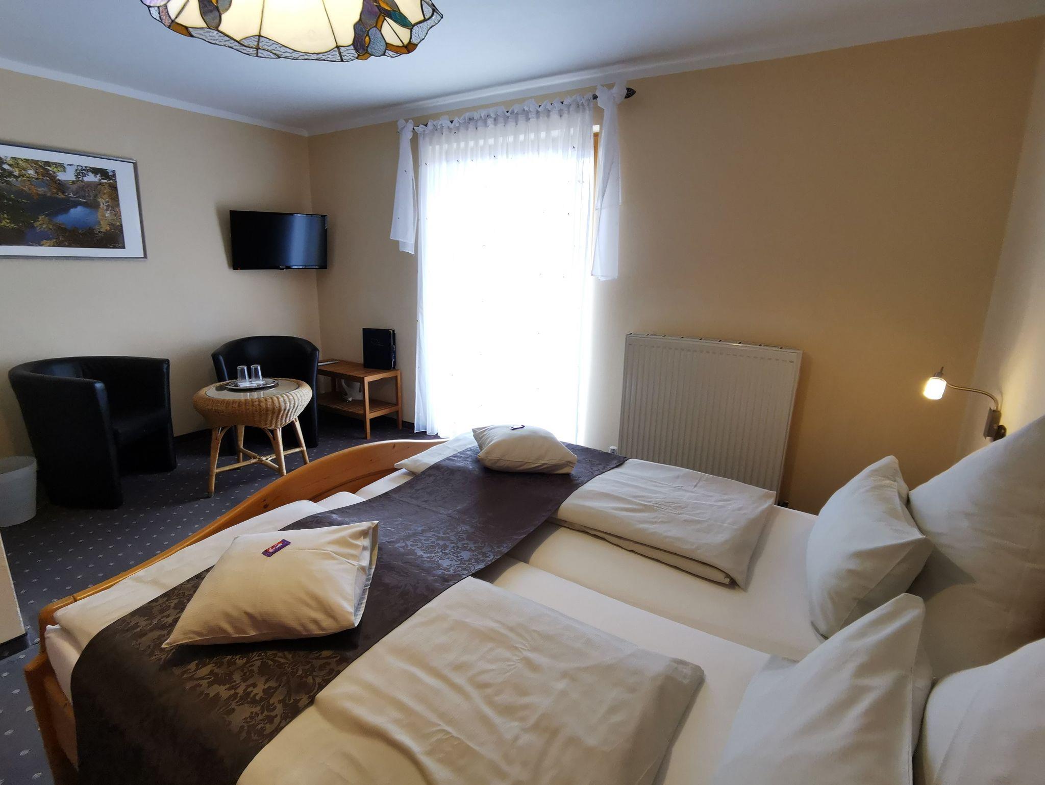 Das Doppelzimmer ist komfortabel mit Doppelbett, Sitzgruppe, TV und WLAN eingerichtet. Der möblierte Balkon bietet eine herrliche Fernsicht nach Süden. Das Badezimmer ist mit Dusche, WC, Fön und Handtüchern ausgestattet.