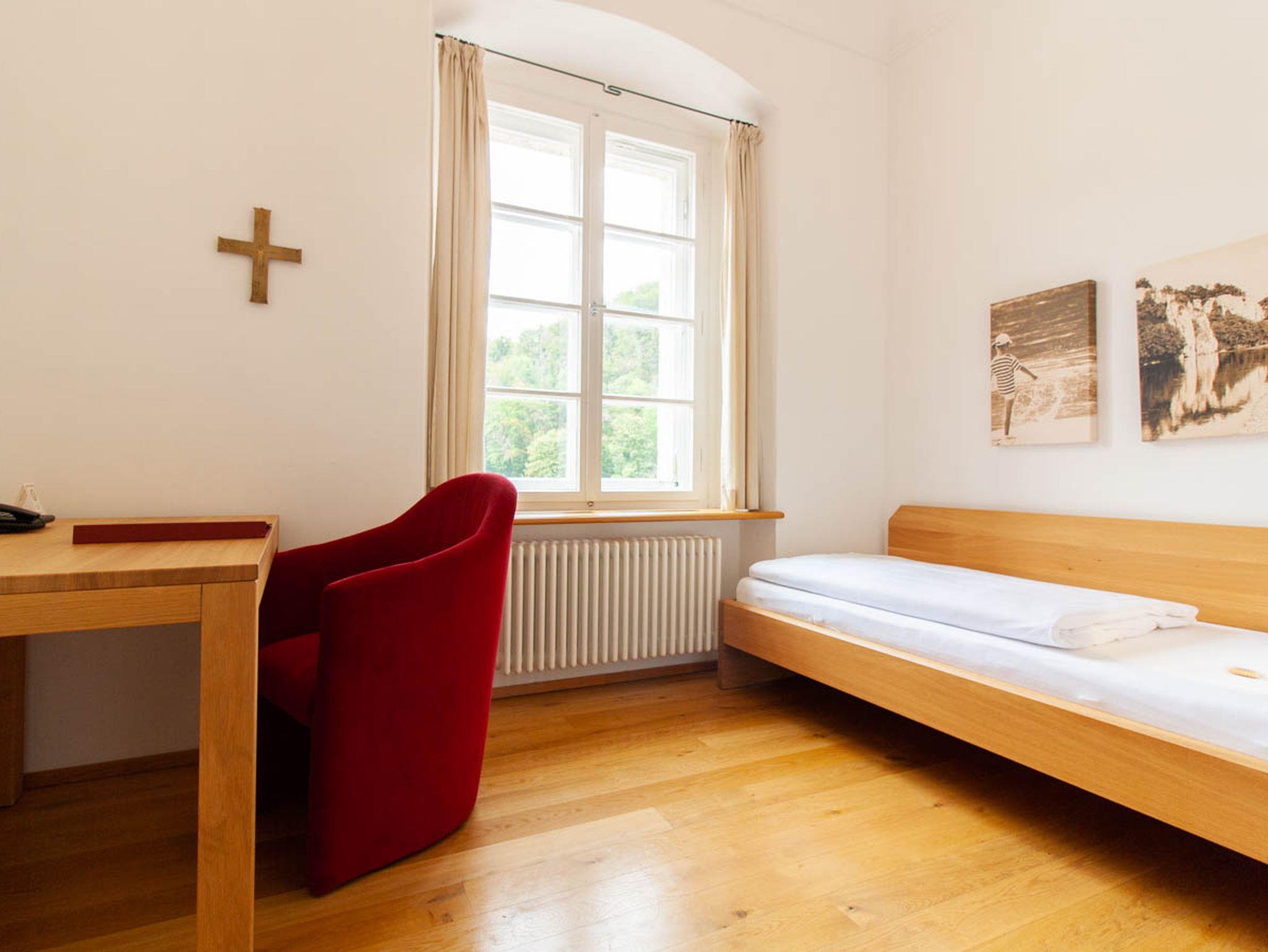 Mit der schlichten, soliden Ausstattung (Bett 90x200 cm, Schrank, Schreibtisch) in modernem Design, passen sich unsere Einzelzimmer im Georgstrakt an die klösterliche Umgebung an. Auf persönlichen Komfort (Dusche, Toilette, Haartrockner, Handtuchheizkörper) und moderne Technik (WiFi, Direktwahltelefon) müssen Sie dennoch nicht verzichten.