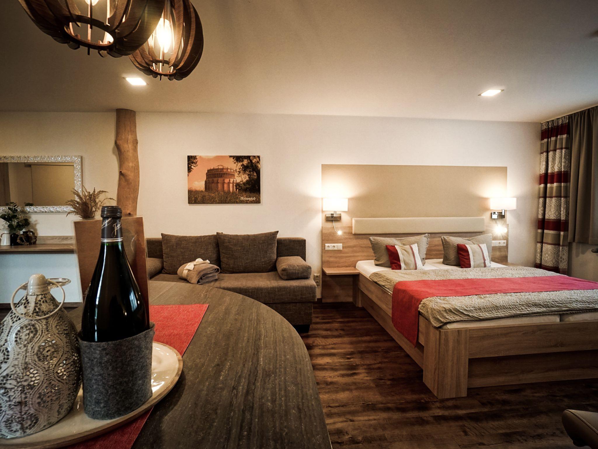 Suite 46 m²,besteht aus einem separatem Schlafzimmer mit Doppelbett für 2 Personen und einem kombiniertem Wohn-und Schlafbereich mit Küchenzeile für 1 Erwachsenen oder 2 Kinder. In beiden Räumen befindet sich ein TV Gerät. Bettwäsche und Endreinigung im Preis enthalten. Zimmerreinigung alle drei Tage, tägliche Reinigung auf Anfrage.