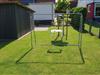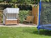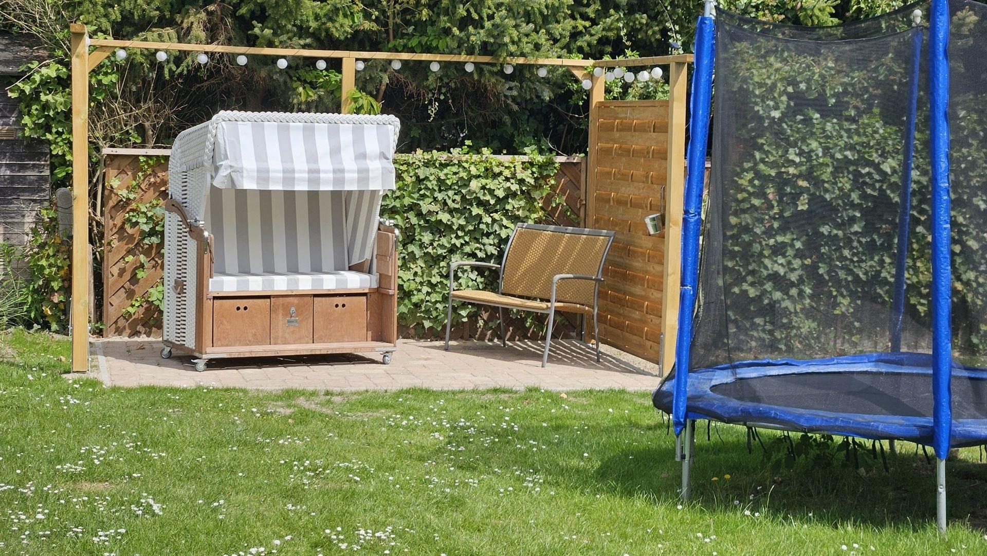 - Gartenmöbel und Spielbereich mit Schaukel und Trampolin im Garten