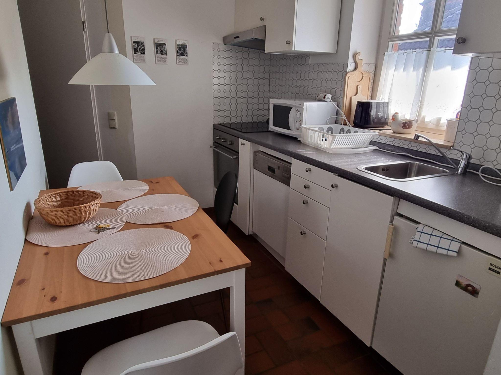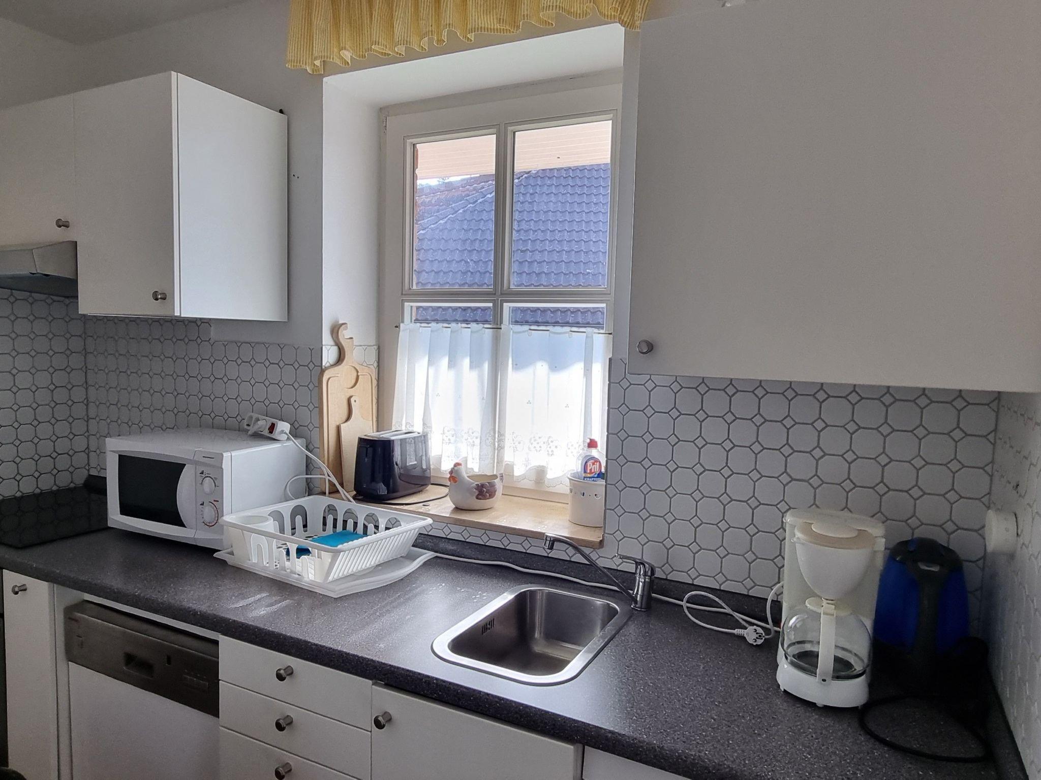 In der Küche befindet sich ein Geschirrspüler, ein Herd mit 4 Platten, sowie ein Backofen und ein Essplatz für 3-4 Personen.