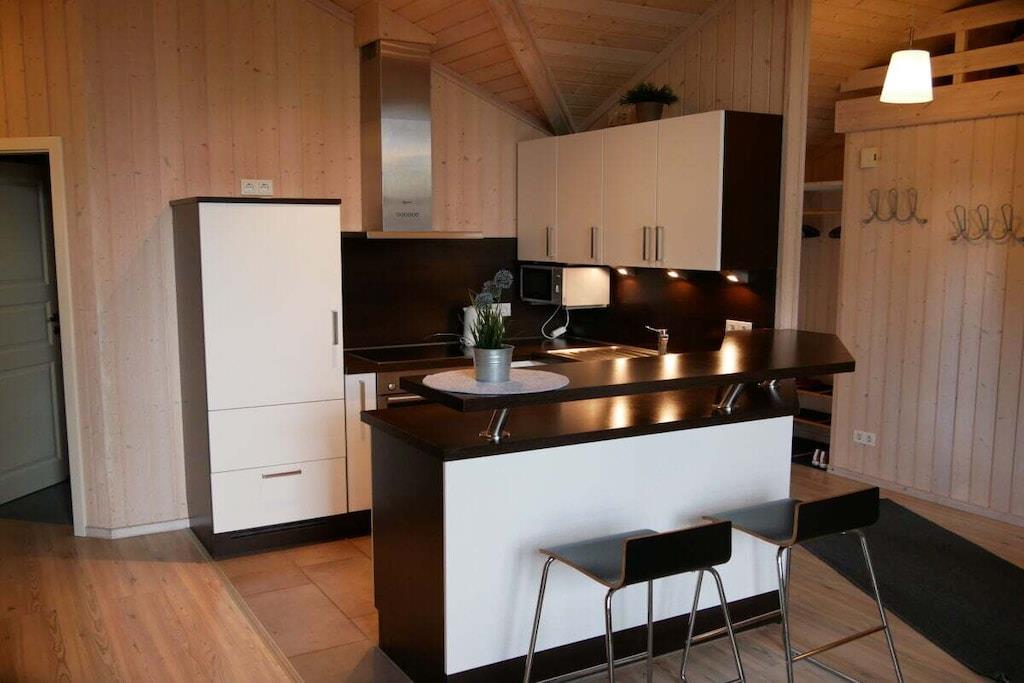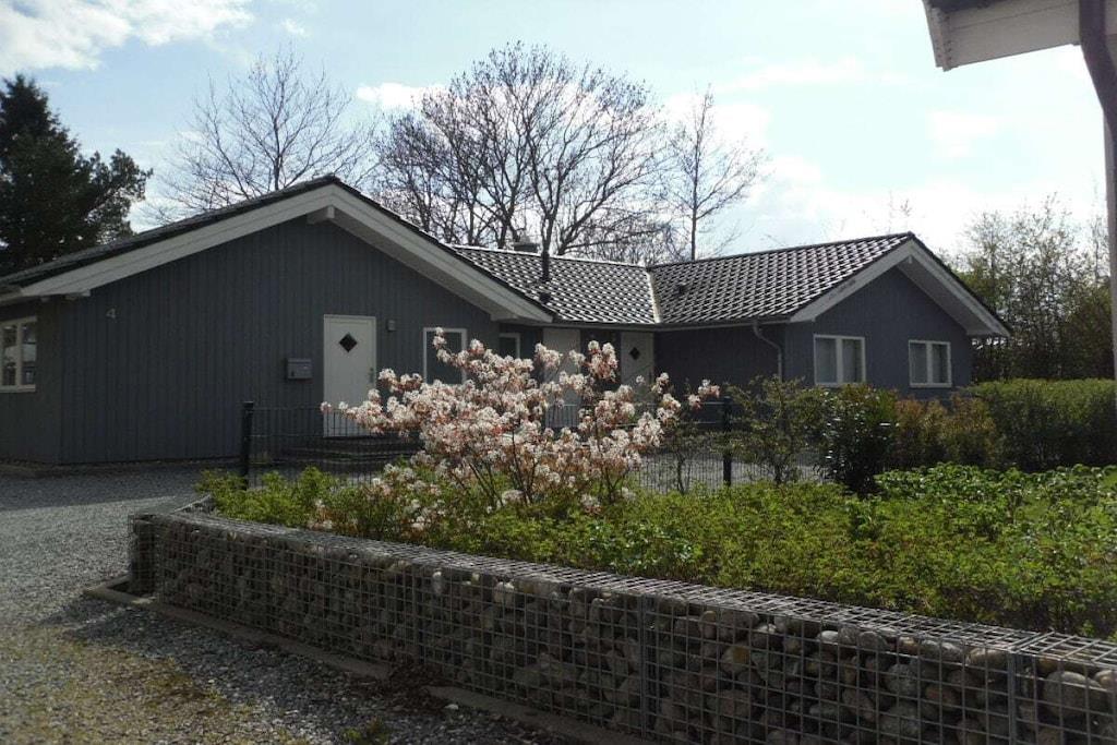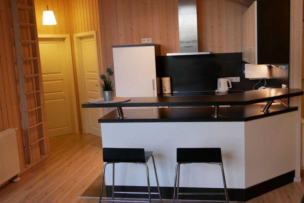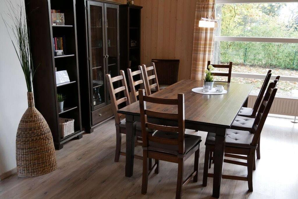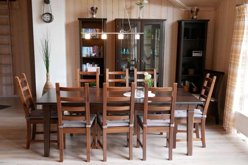 Dieses 100 qm große Ferienhaus mit Sauna für max. 6 Personen mit offener Deckenkonstruktion und großen Fensterfronten ist ein typisches Holzhaus wie Sie es sonst nur in Dänemark finden. Hier kann die kleine und große Familie relaxen und ausspannen und herrliche Urlaubstage verleben in einem kleinen ruhigen Wohngebiet nur ca. 5 Gehminuten vom Strand entfernt. Zu jeder Jahreszeit sitzen Sie im sehr großzügigen und offenen Wohn- und Essbereich oder bei schönem Sonnenwetter aber auch bei "Seewetter" auf der großen teilweise überdachten Terrasse und genießen den Ausblick in den Garten. Die offene Küche ist modern und komfortabel eingerichtet und ein Tresen lädt zum Verweilen in der Küche ein.