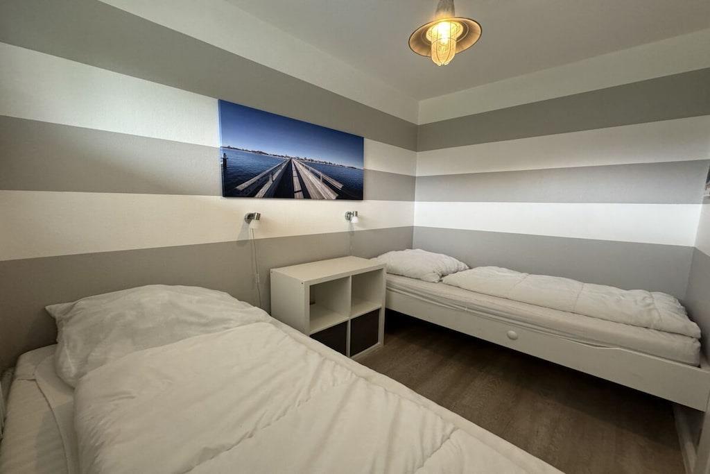 Willkommen in unserer charmanten Ferienwohnung in Kellenhusen! Mit einer Fläche von 53 qm und 1,5 Zimmern bietet unsere modern ausgestattete Ferienwohnung den idealen Rückzugsort für bis zu vier Personen. Das Wohnzimmer lädt mit einem gemütlichen Sofa und einem beeindruckenden 55-Zoll-Fernseher zum Entspannen ein. Die angrenzende Essecke und die offene Küche bieten alles, was Sie für einen erholsamen Urlaub benötigen: einen Kühlschrank mit Gefrierfach, eine Spülmaschine, einen Herd mit Backofen, eine Kaffeemaschine, einen Wasserkocher, einen Toaster sowie ausreichend Geschirr. Der Schlafbereich ist durch einen Vorhang unterteilt und bietet ein komfortables Doppelbett (1,80 x 2,00 m) sowie einen geräumigen Kleiderschrank. Das separate Schlaf- bzw. Kinderzimmer verfügt über zwei Einzelbetten (jeweils 90 x 200 cm) sowie Fliegen- bzw. Mückenschutz und ein Plissee. Das moderne Badezimmer ist mit einer bodentiefen Dusche, einem WC und einem Handtuchheizkörper ausgestattet. Die Wohnung verfügt über eine große nach Südwesten ausgerichtete Loggia mit Balkonmöbeln. Im Keller stehen Ihnen gegen Gebühr eine Waschmaschine und ein Trockner zur Verfügung. Zudem verfügt die Wohnung über einen eigenen PKW-Stellplatz.