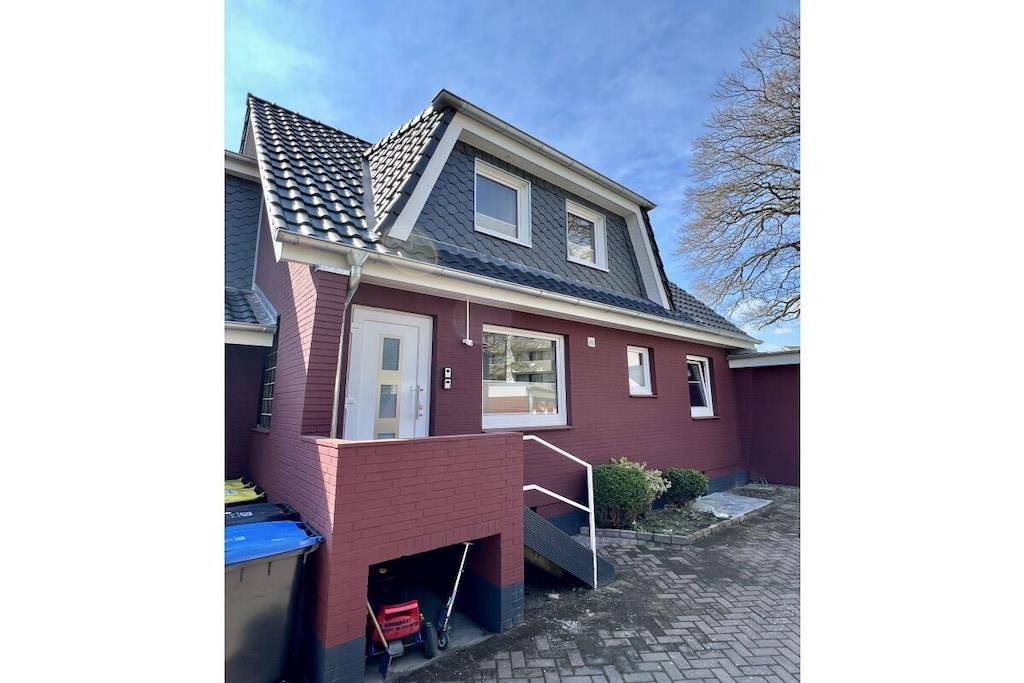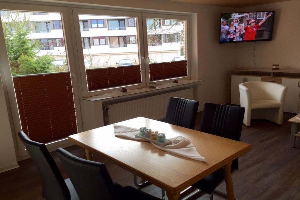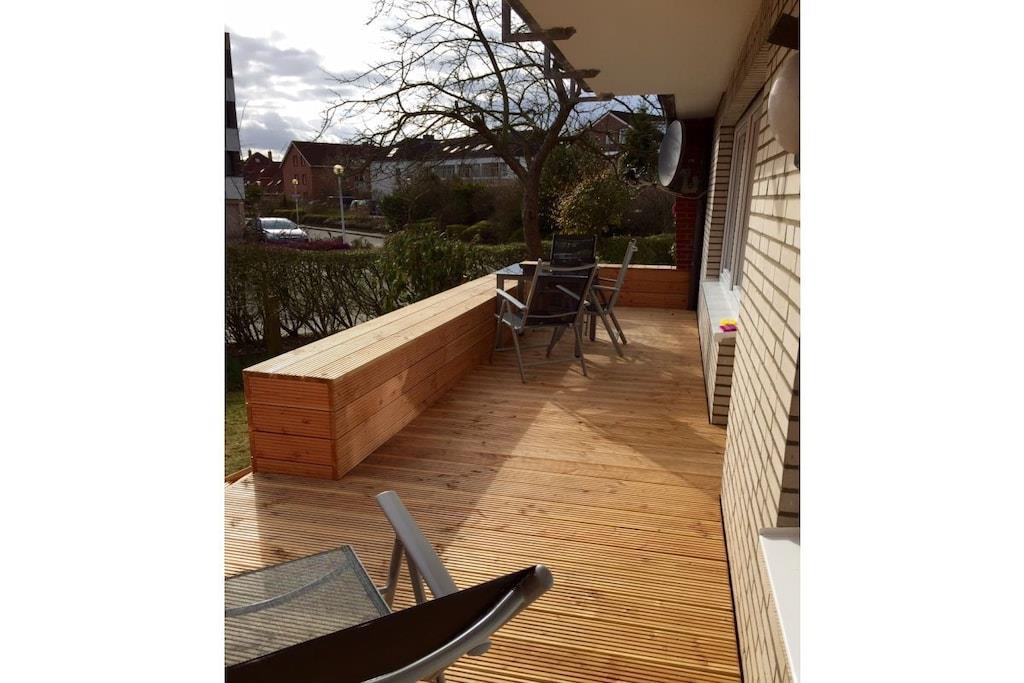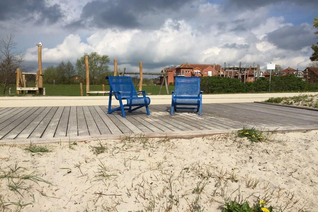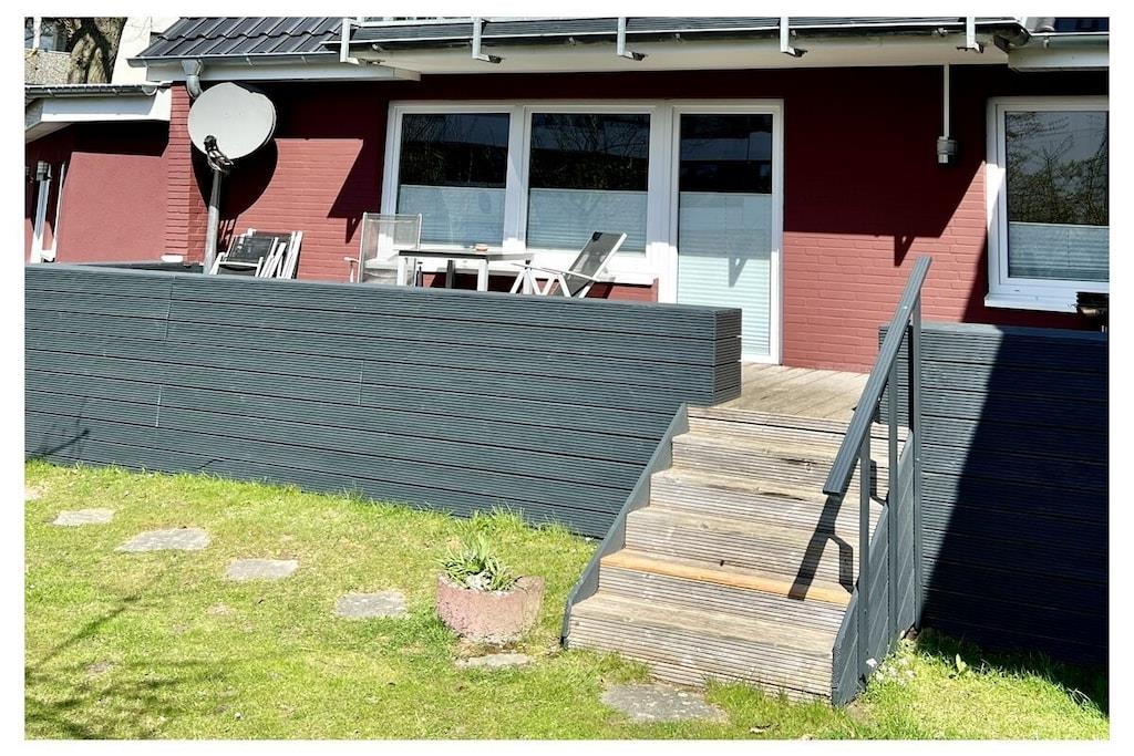 Die 65 m² große Erdgeschosswohnung bietet 2 Schlafzimmer, ein modernes Bad, eine komplette Küche mit Geschirrspüler sowie ein gemütliches Wohn-/Esszimmer. Eine private Terrasse mit Gartenmöbeln lädt zum Entspannen ein. Strand und Promenade sind in wenigen Minuten erreichbar. Parkplatz direkt am Ferienhaus. Im Innenhof befindet sich für die Allgemeinheit ein Außenkamin ( Grill )