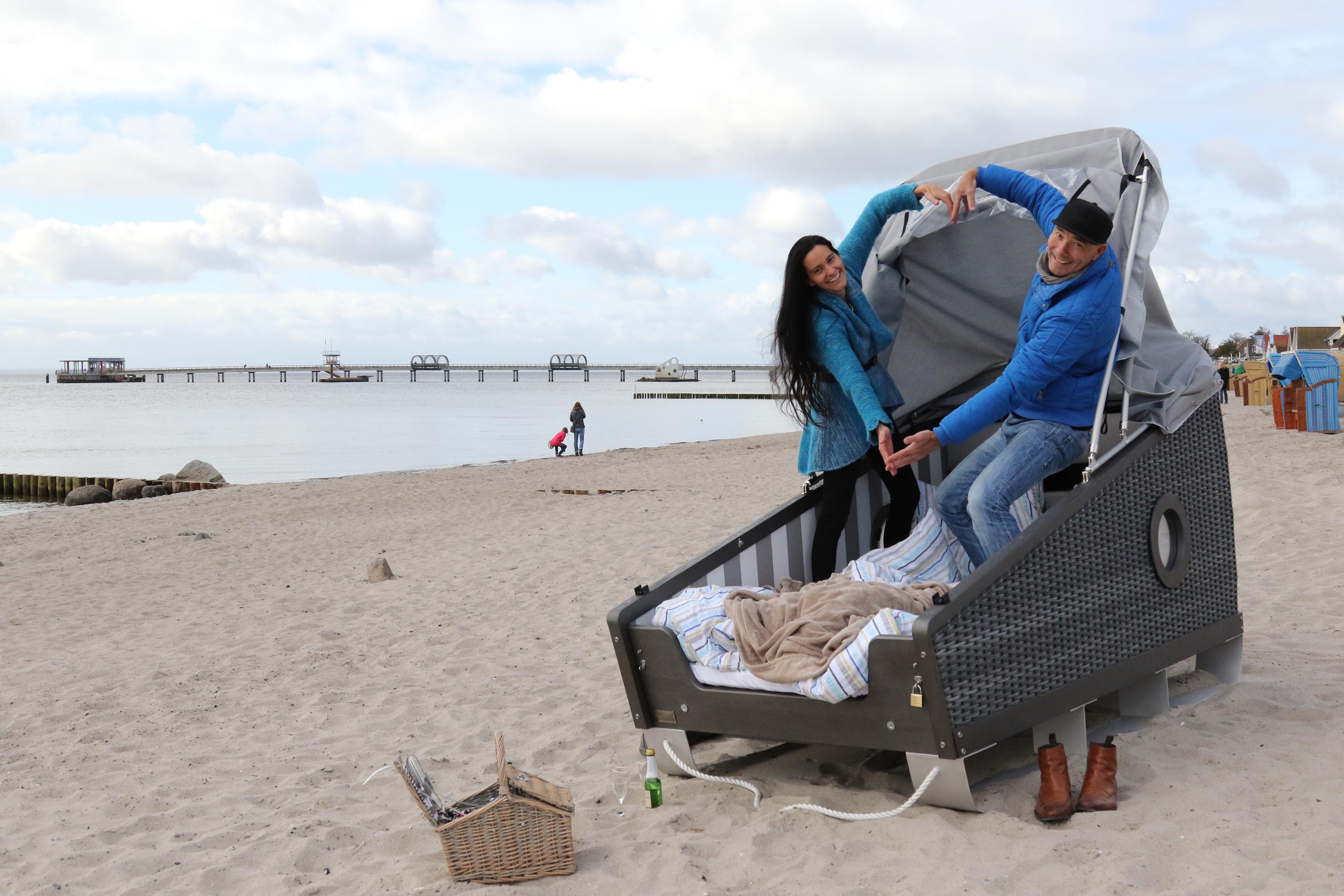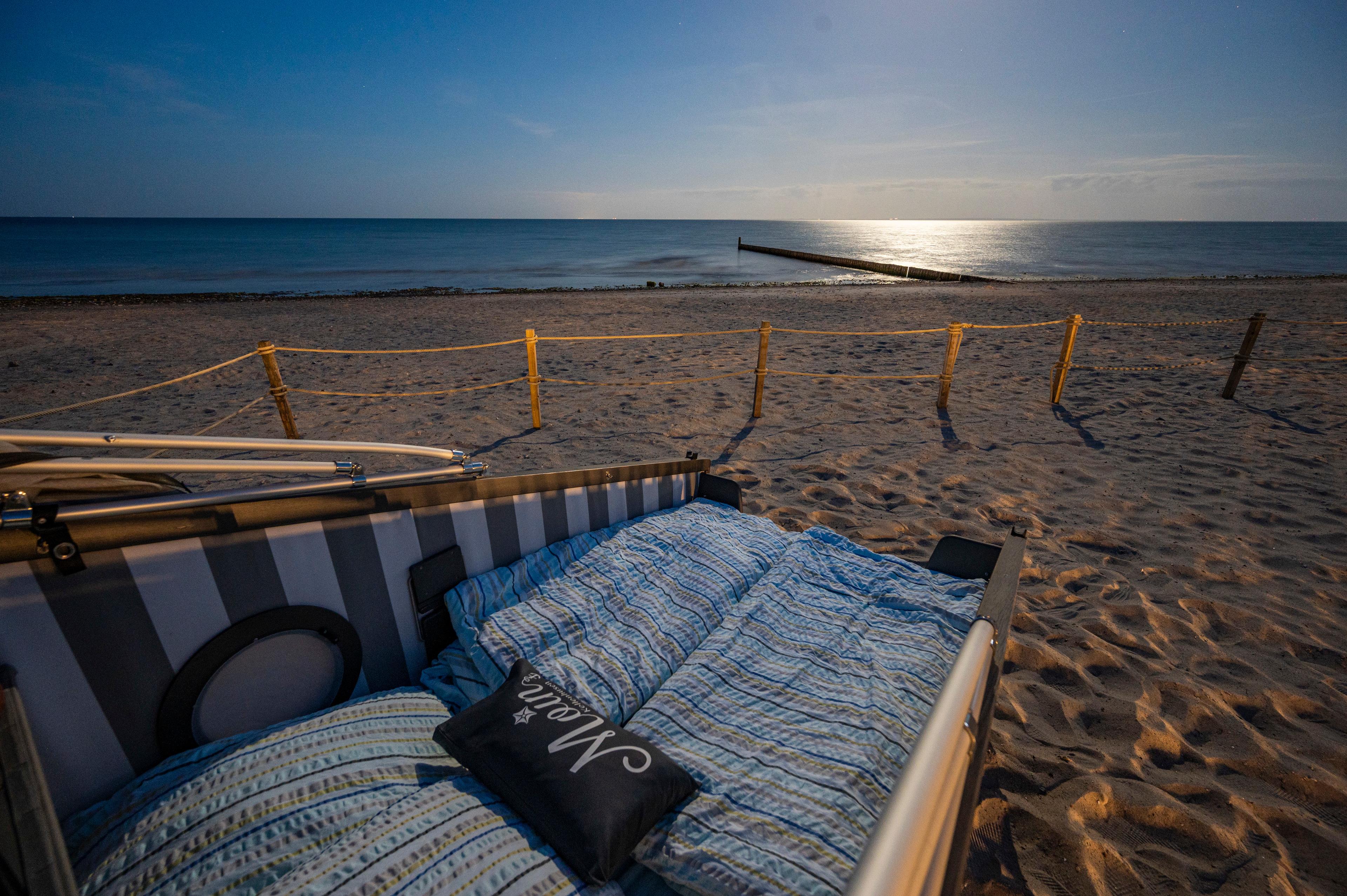 Erleben Sie eine einzigartige Übernachtung im Schlafstrandkorb direkt am Strand von Kellenhusen mit Meerblick.