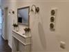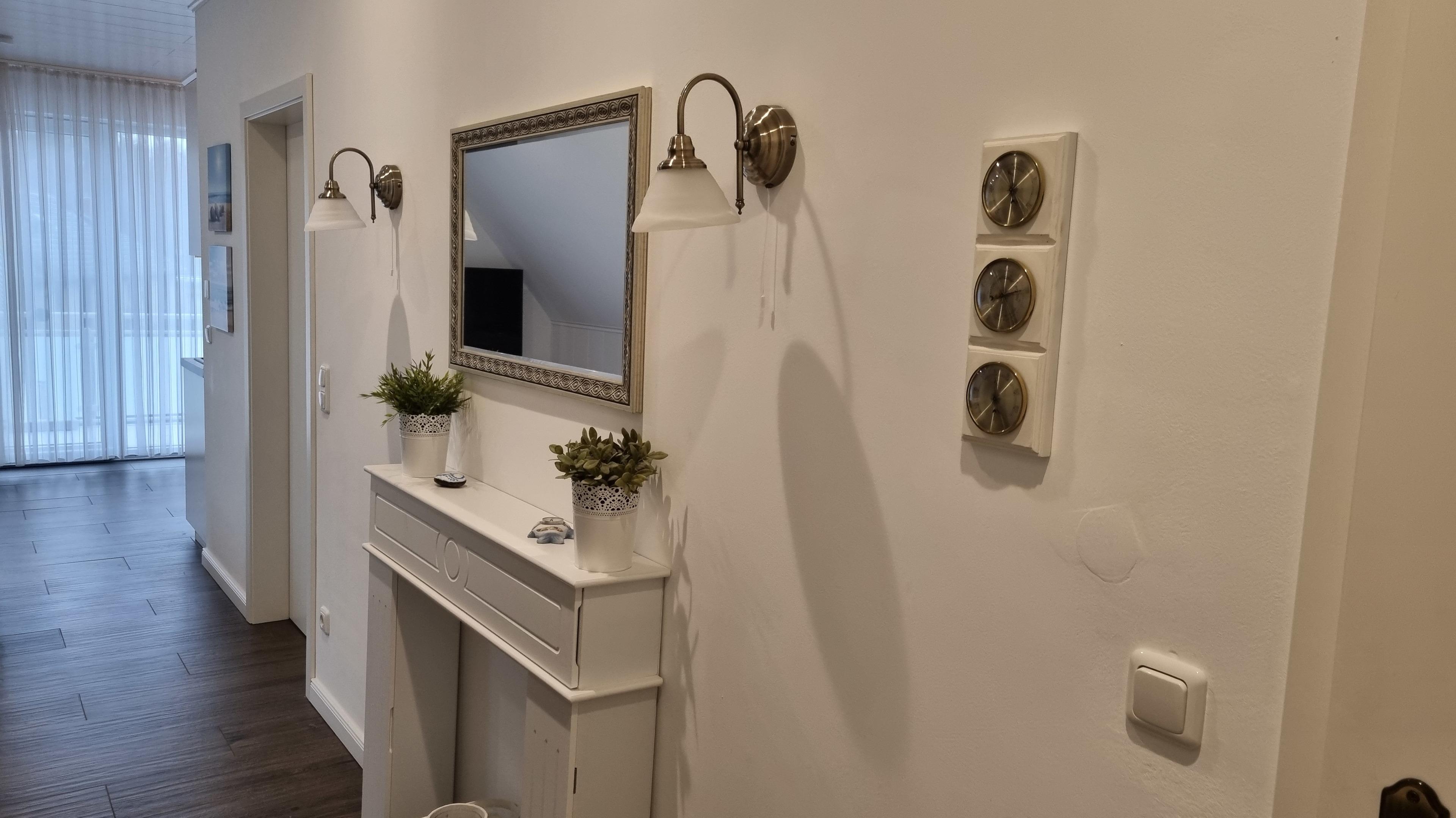 Föhn und Schminkspiegel sind vorhanden.