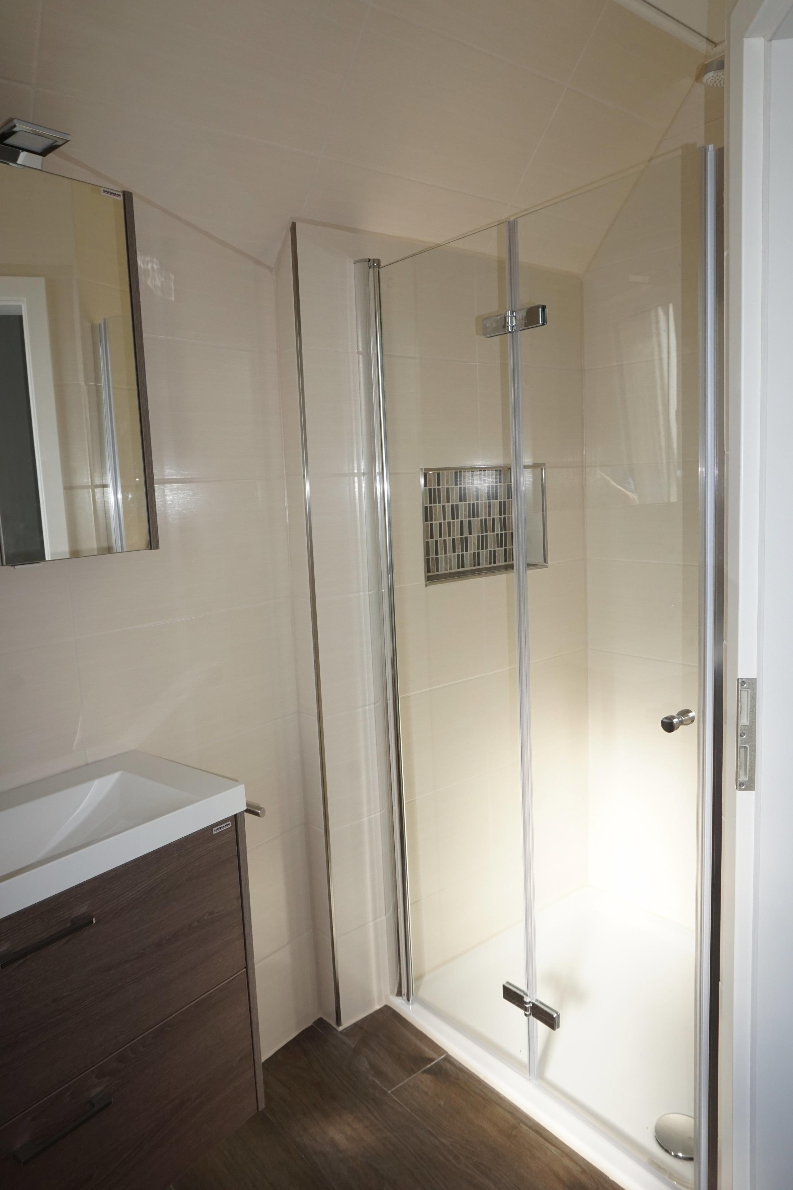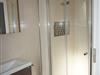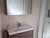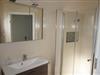 Das Badezimmer mit Tageslicht verfügt über eine Dusche mit niedrigem Einstieg, Waschtisch mit Spiegelschrank und WC.