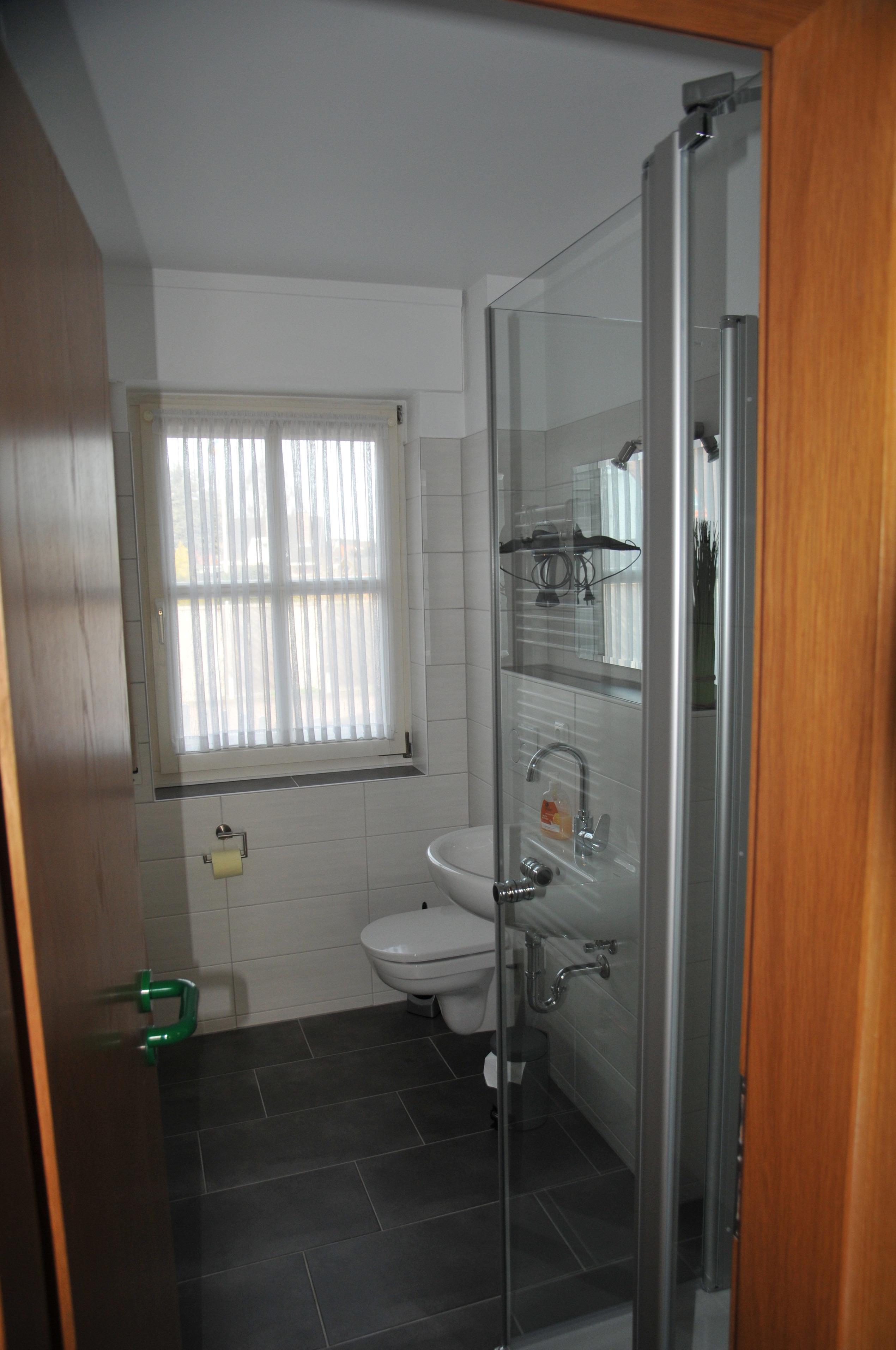 Das Bad ist mit Dusche, Waschtisch und WC ausgestattet und verfügt über ein Fenster mit Außenrollade.