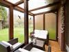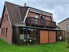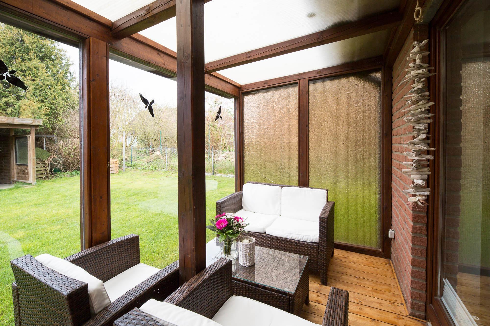 Die überdachte Terrasse ist vom Wohnzimmer aus zugänglich und führt direkt auf die Rasenfläche.
