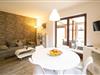 Das Wohnzimmer ist mit einem Sofa, Küchenzeile und Essbereich ausgestattet.