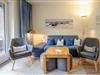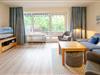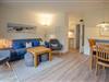 Die helle, 3-Raum-Wohnung in strandnähe im Ostseebad Kellenhusen mit 2 separaten Schlafzimmern, Südbalkon und Blick ins Grüne besitzt ein modern eingerichtetes Wohnzimmer mit Doppelschlafcouch, zwei Sesseln und einem Couchtisch.