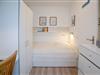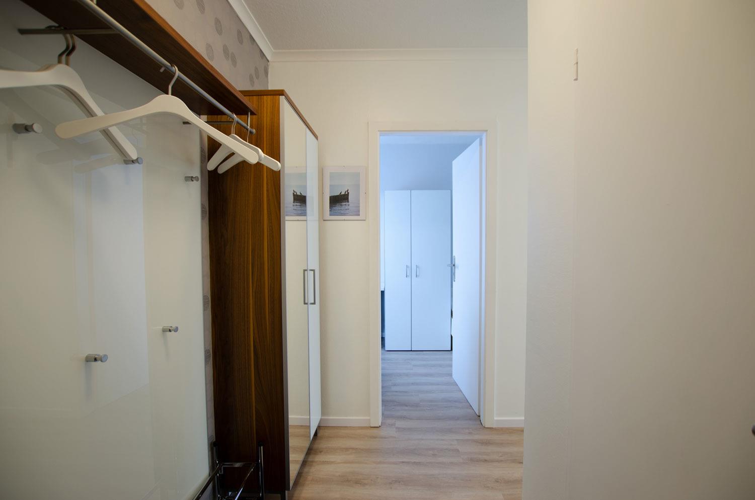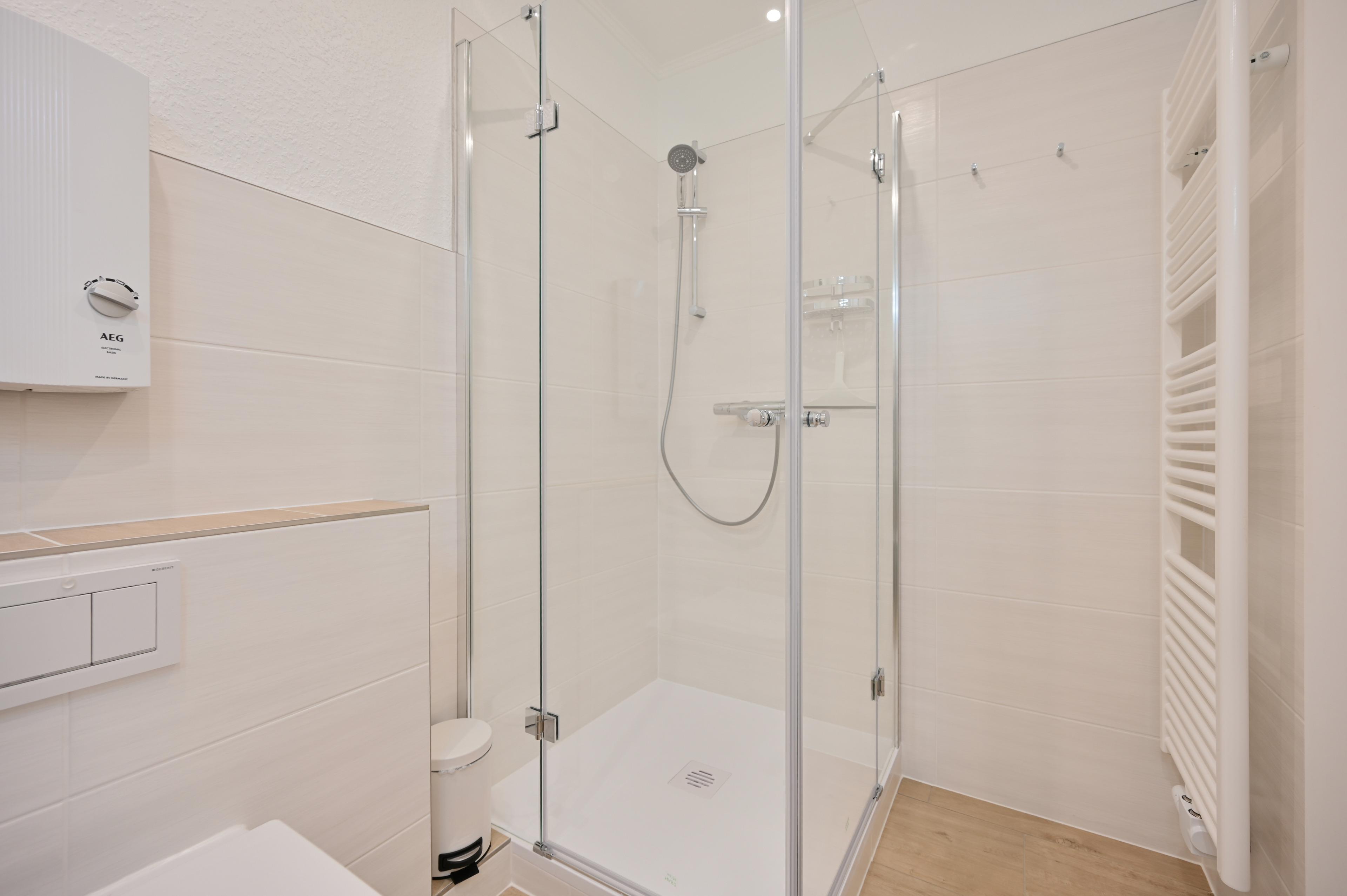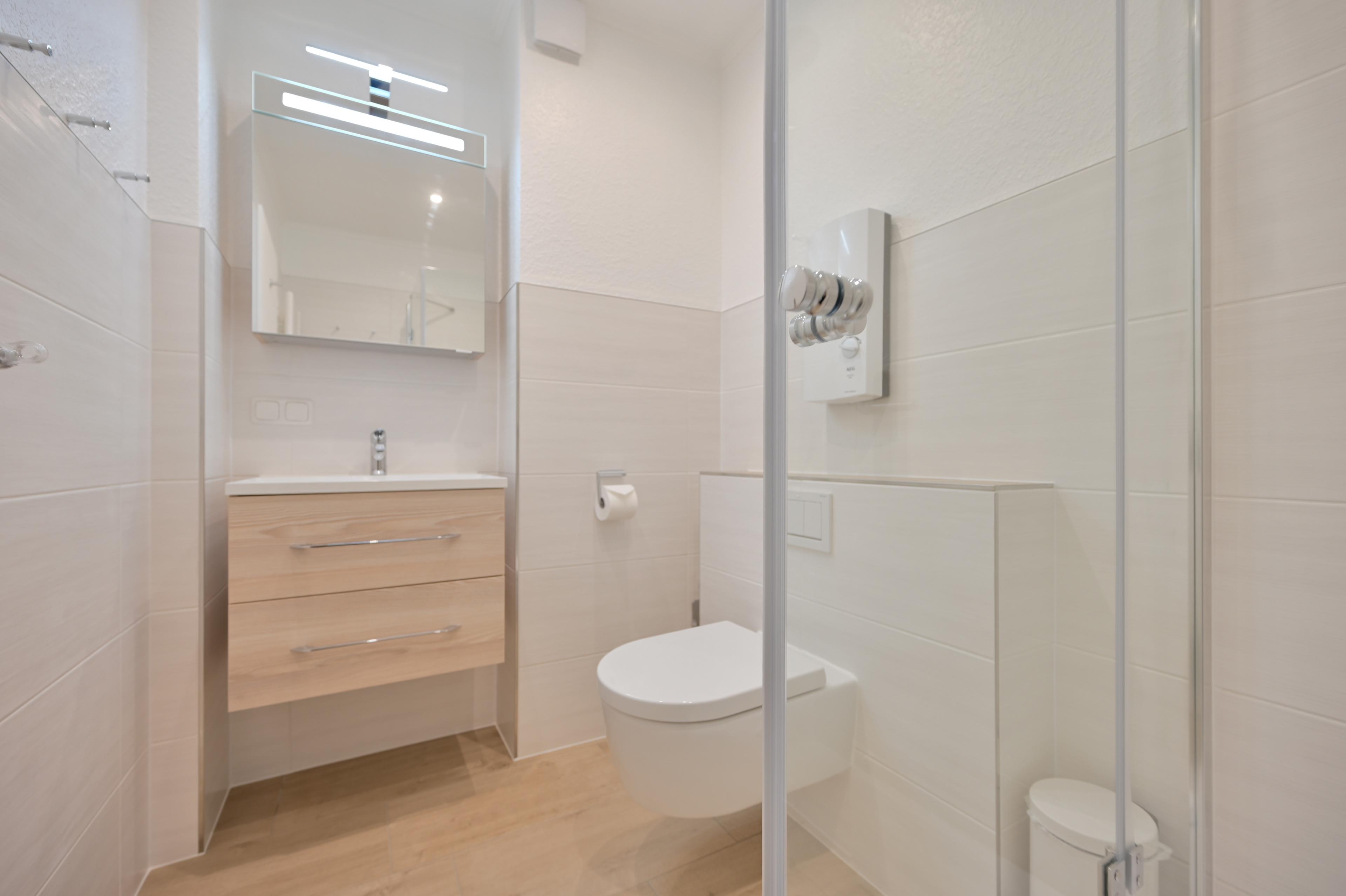 Die farblich aufeinander abgestimmte Ferienwohnung verfügt außerdem über ein Badezimmer mit Dusche, WC und einem Einbauschrank. Zur Wohnung gehört auch eine Abstellkammer.