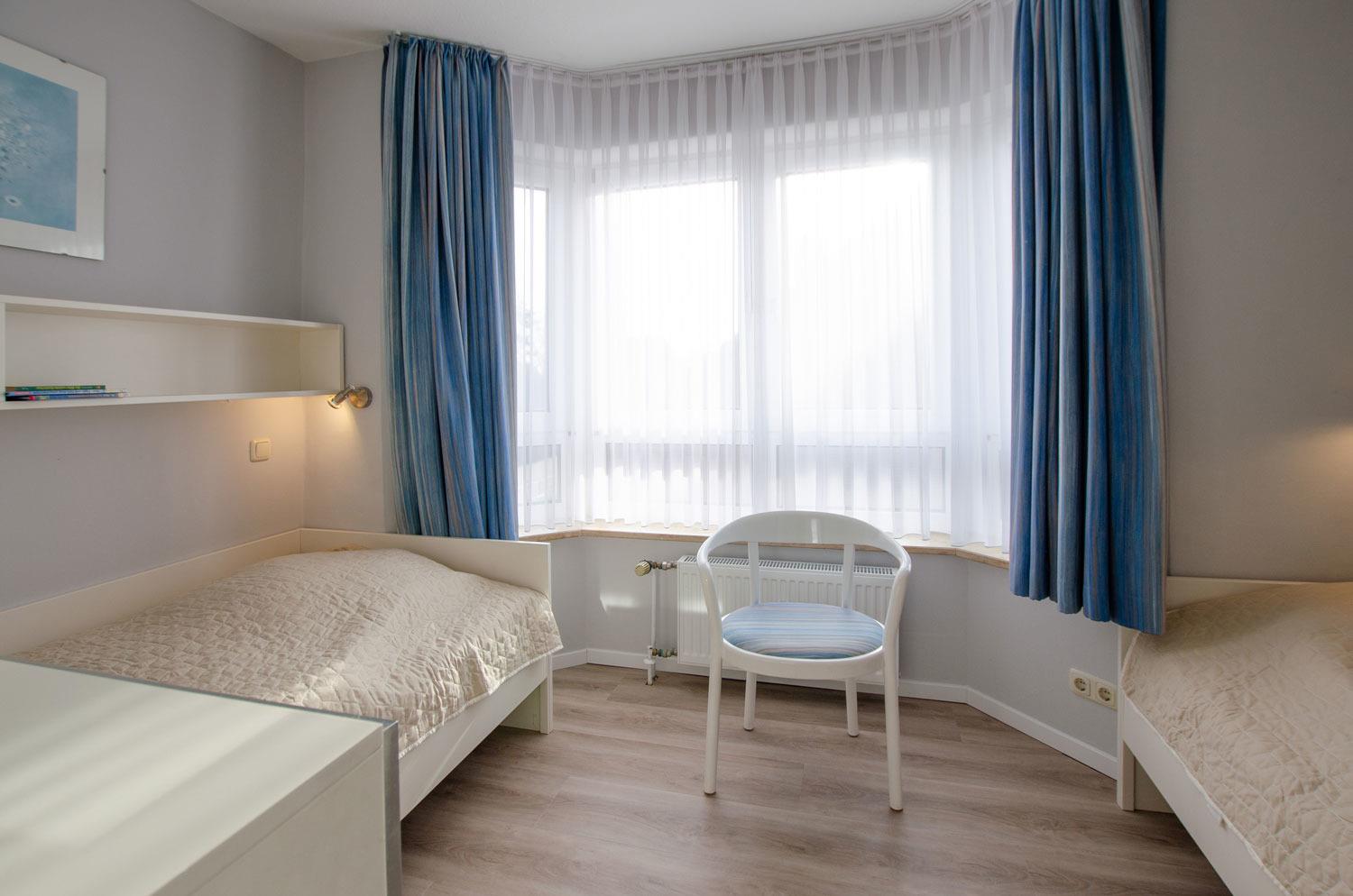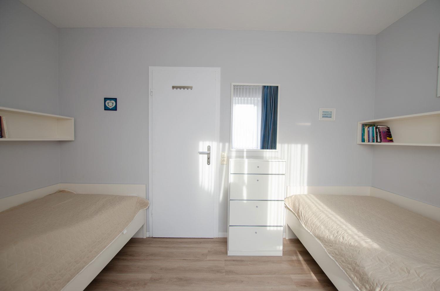 Im Schlafzimmer befinden sich zwei Einzelbetten (100x200) mit Überbauregalen und eine Kommode.
