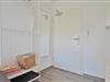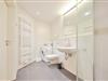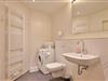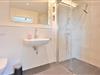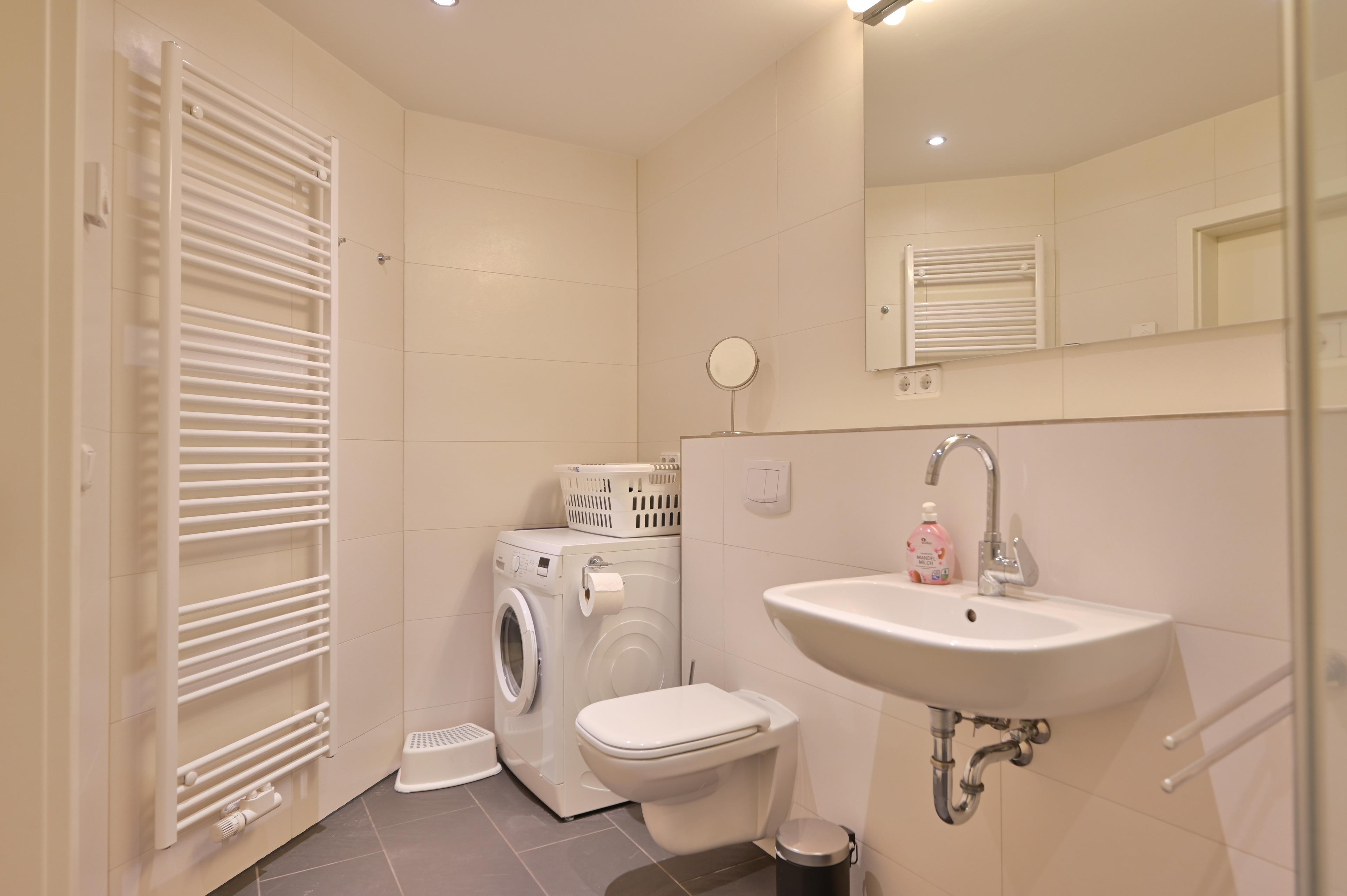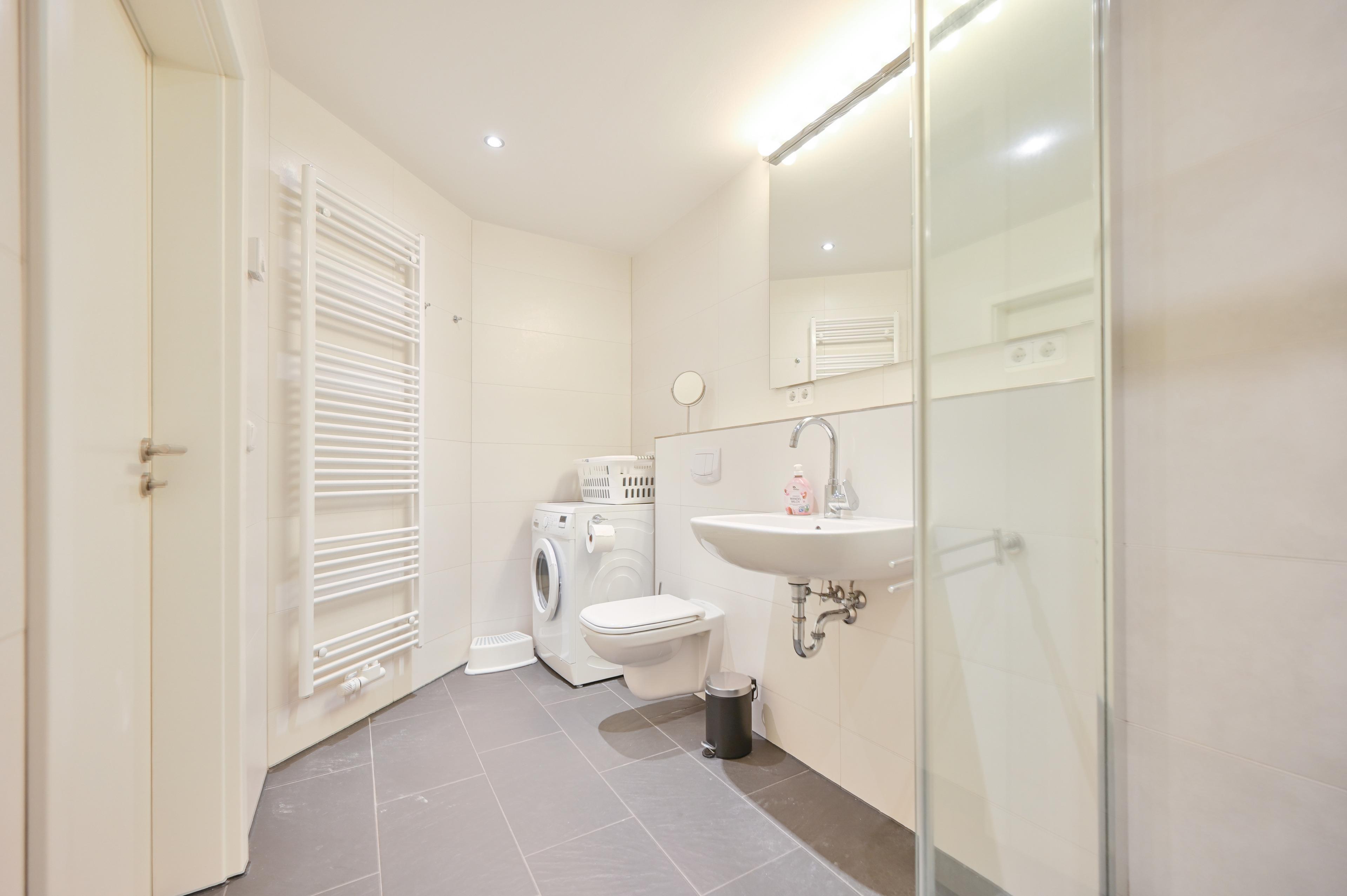 Das moderne Badezimmer ist mit großer, ebenerdiger Dusche, Waschbecken, WC und Waschmaschine ausgestattet.