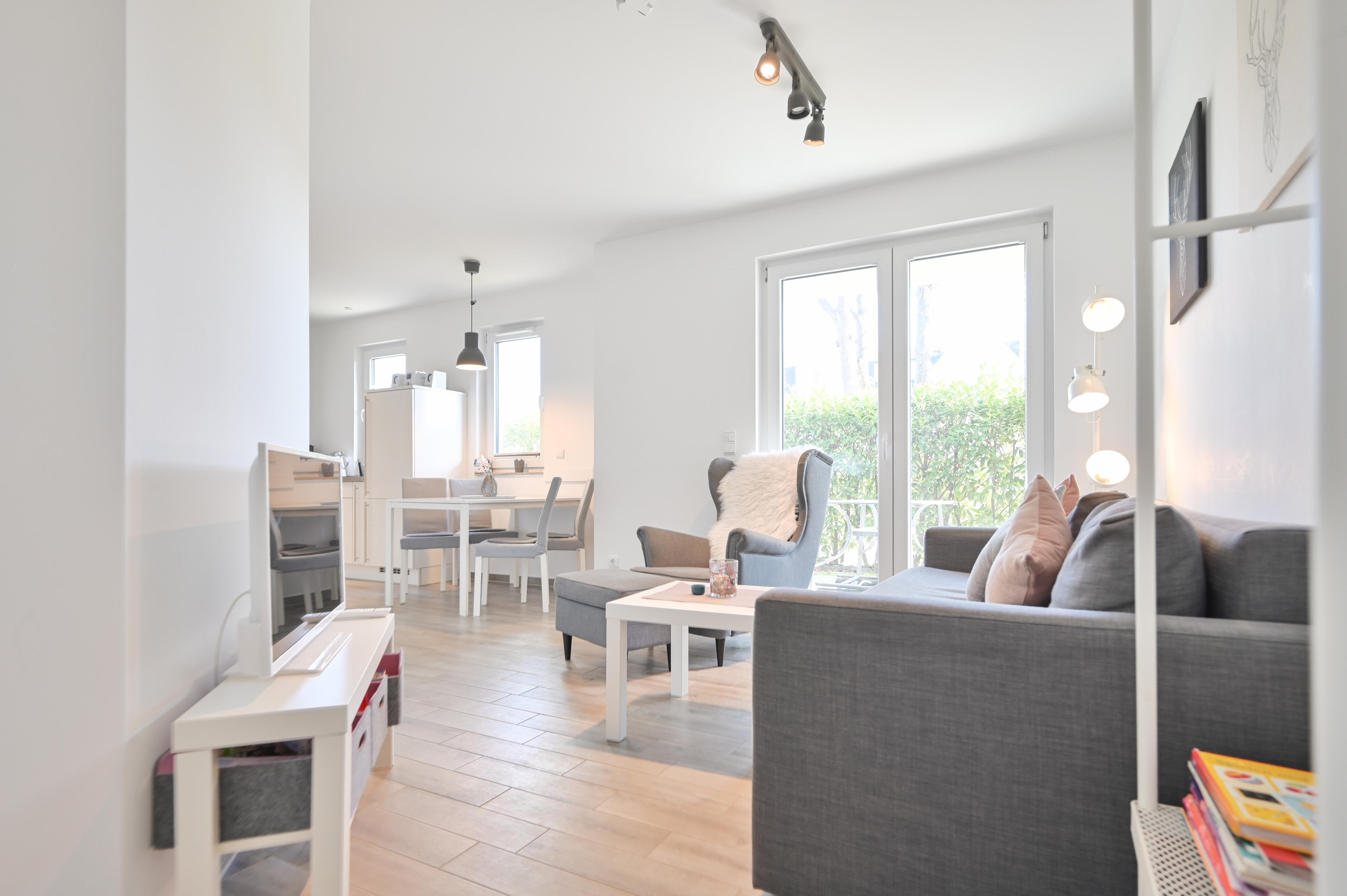Das bequem eingerichtete Wohnzimmer verfügt über eine 3er Schlafcouch (160 cm Liegefläche), Couchtisch, gemütlichem Sessel, TV-Möbel mit Flachbild-Fernseher und Zugang zur Terrasse Richtung Ostsee.