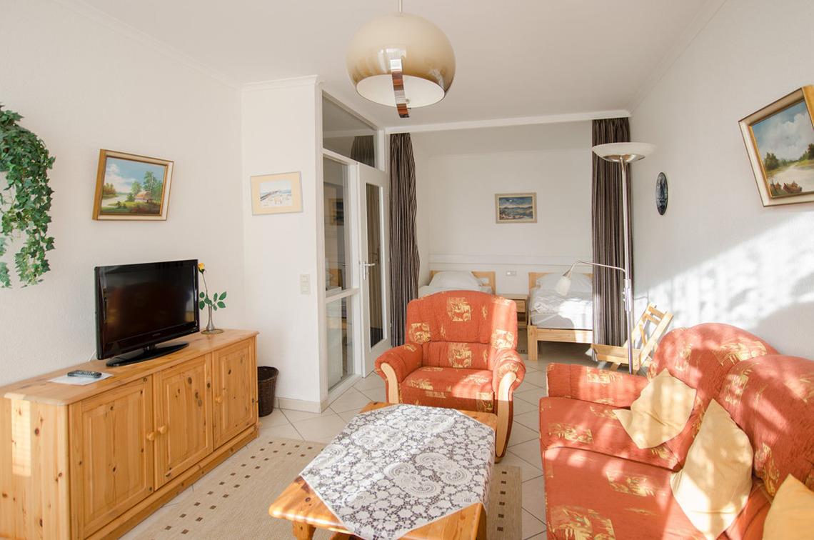 Der Wohnschlafraum ist ausgestattet mit einer 2er Couch, Couchtisch, Anrichte und zwei Einzelbetten, die durch einen Vorhang vom Wohnbereich abtrennbar sind.