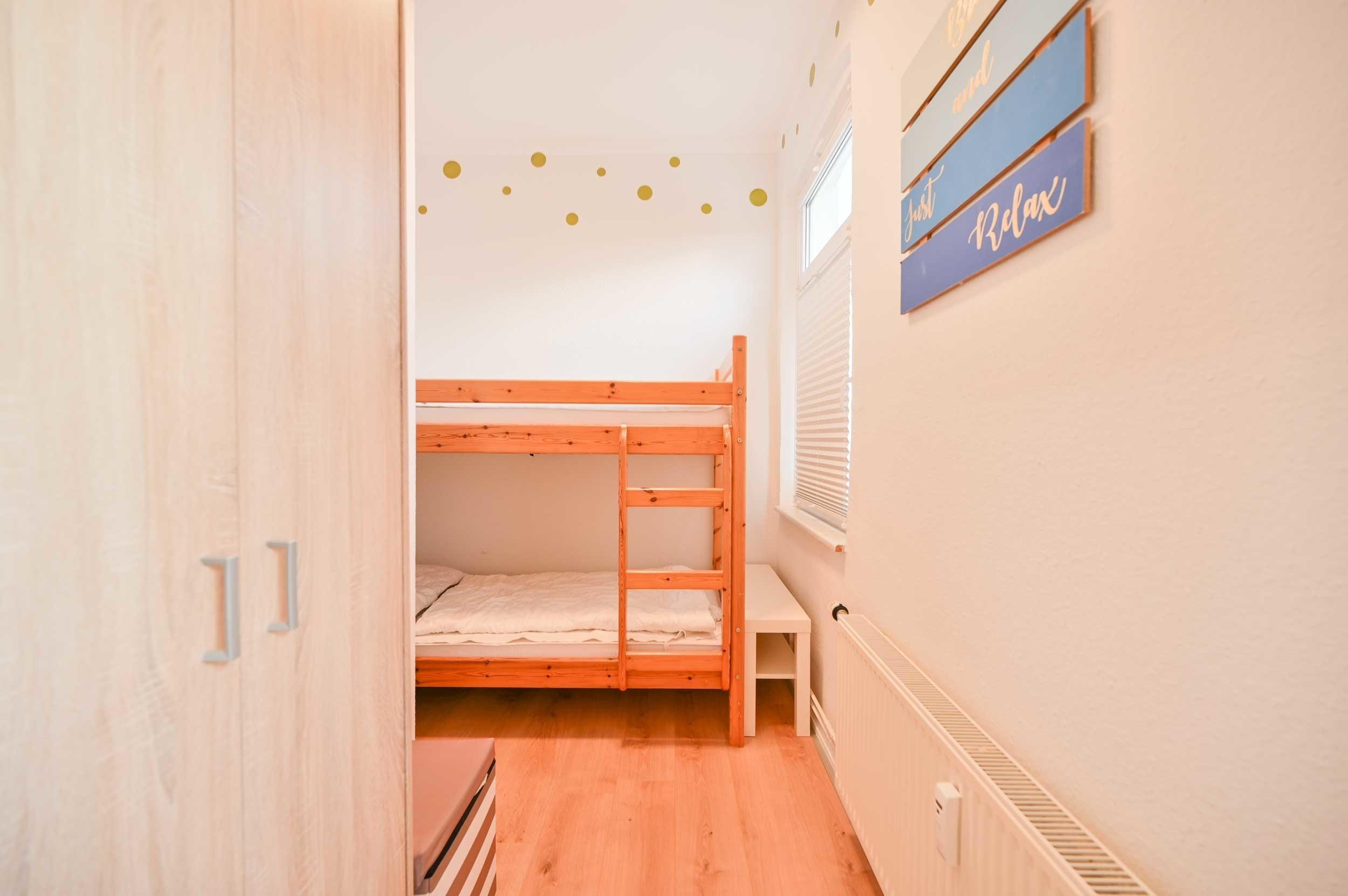 Die freundlich un hell eingerichtete Ferienwohnung liegt im 1 OG. der "Villa Hoffnung" wurde 2016 renoviert und bietet mit 42 Quadratmetern Platz für Schlafcouch (schnell und bequem zu 160cm x 200cm Schlafmöglichkeit umzufunktionieren) und einen 40" Flachbild-TV, ein separates Schlafzimmer mit Etagenbett sowie ein hochwertiges Duschbad.