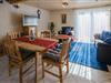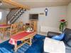 Die Ferienwohnung verfügt über ein Wohnzimmer mit integrierter Küchenzeile und Zugang zur möblierten Terrasse. Außerdem finden Gäste im Wohnzimmer eine Couchecke und einen Essplatz mit vier Stühlen. Vom Wohnzimmer aus führt eine Treppe ins Obergeschoss.