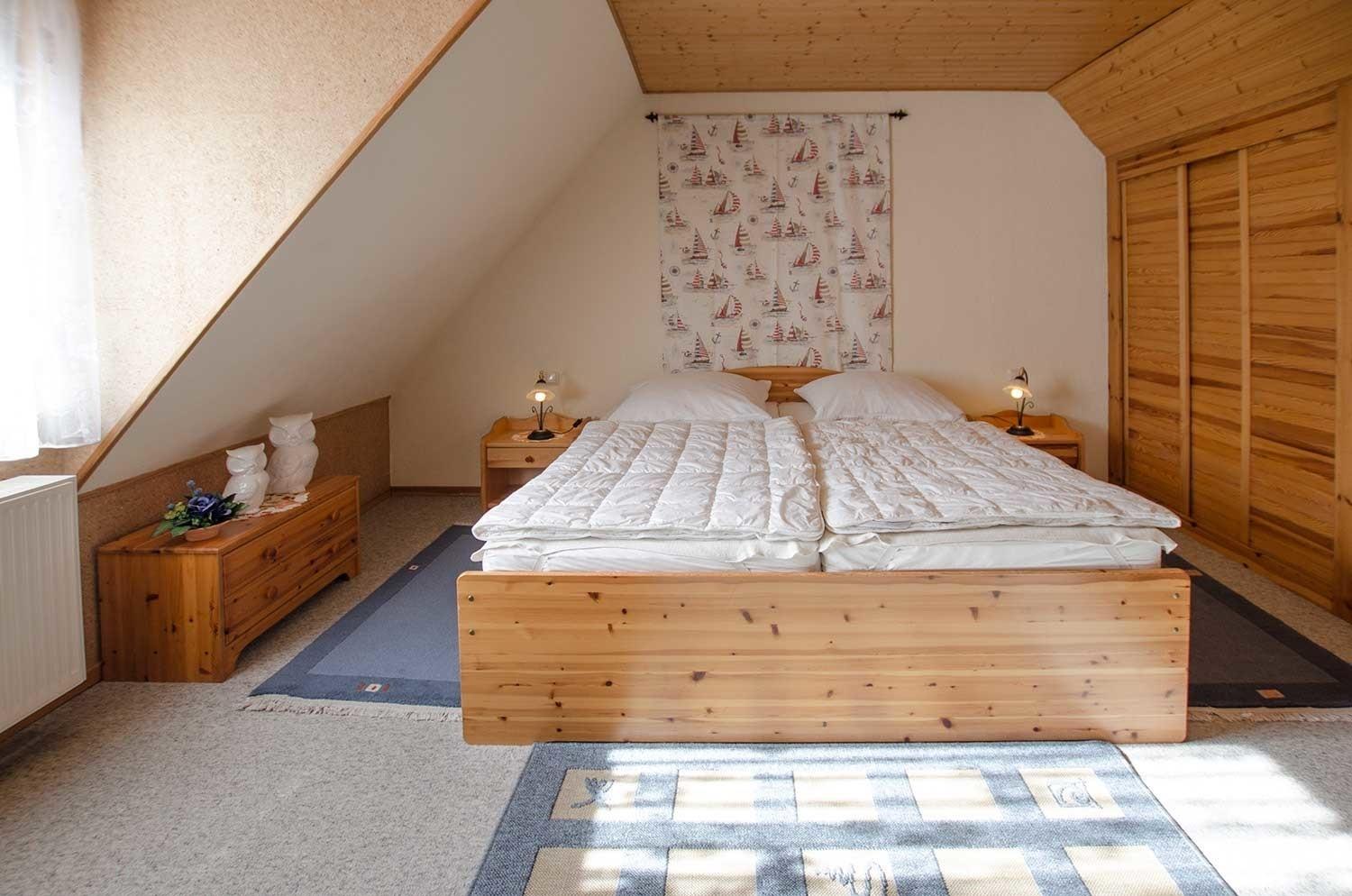 Das separate Schlafzimmer im Obergeschoss verfügt über ein Doppelbett (200x200) und einen großen Einbauschrank. Zur Wohnung gehört außerdem ein Bad mit Dusche und WC. Außerdem verfügt die Ferienwohnung über ein Garderobe im Eingangsbereich.
