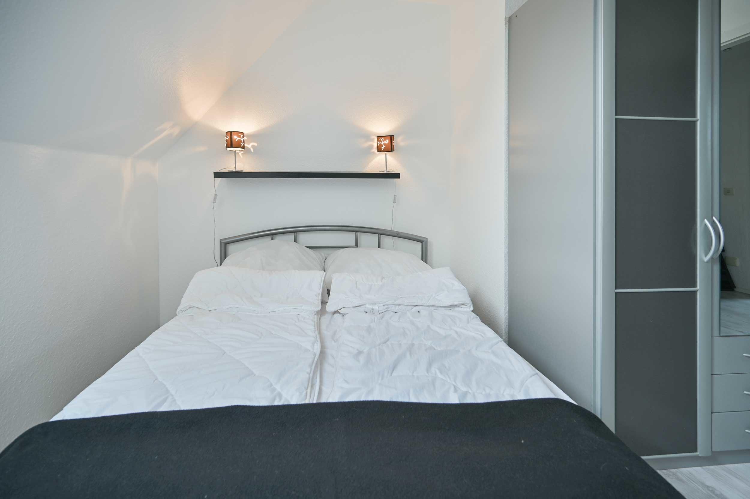 Separates Schlafzimmer mit Doppelbett (1,40 x 2,00) und Kleiderschrank.