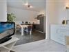 Das Wohnzimmer verfügt über eine Couch, Couchtisch, Sessel, Kommode, TV-Möbel mit Flachbild-TV, Essbereich mit 4 Stühlen und eine moderne, integrierte Küchenzeile.