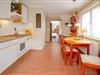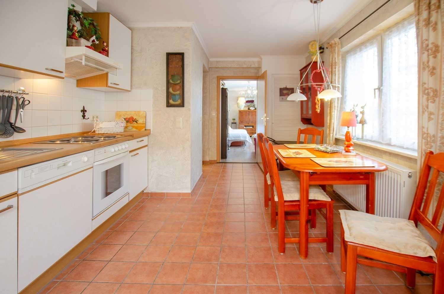 Die große Küche ist gut ausgestattet und verfügt über einen Essbereich am Fenster.