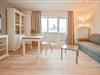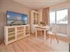 Die Ferienwohnung "Elke" verfügt über ein Wohnschlafzimmer mit Schlafsofa, einem Sessel, Couchtisch, einer Essecke mit Tisch und Stühlen, Kommode mit Schubladen und TV. Außerdem haben Gäste von hier aus Zugang zum möblierten Balkon in Richtung Ostsee.