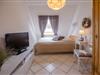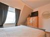 Separates Schlafzimmer mit Doppelbett (140 x 200 cm) Kleiderschrank, Nachttisch mit Leselampe, TV und ein offenes Regal.
