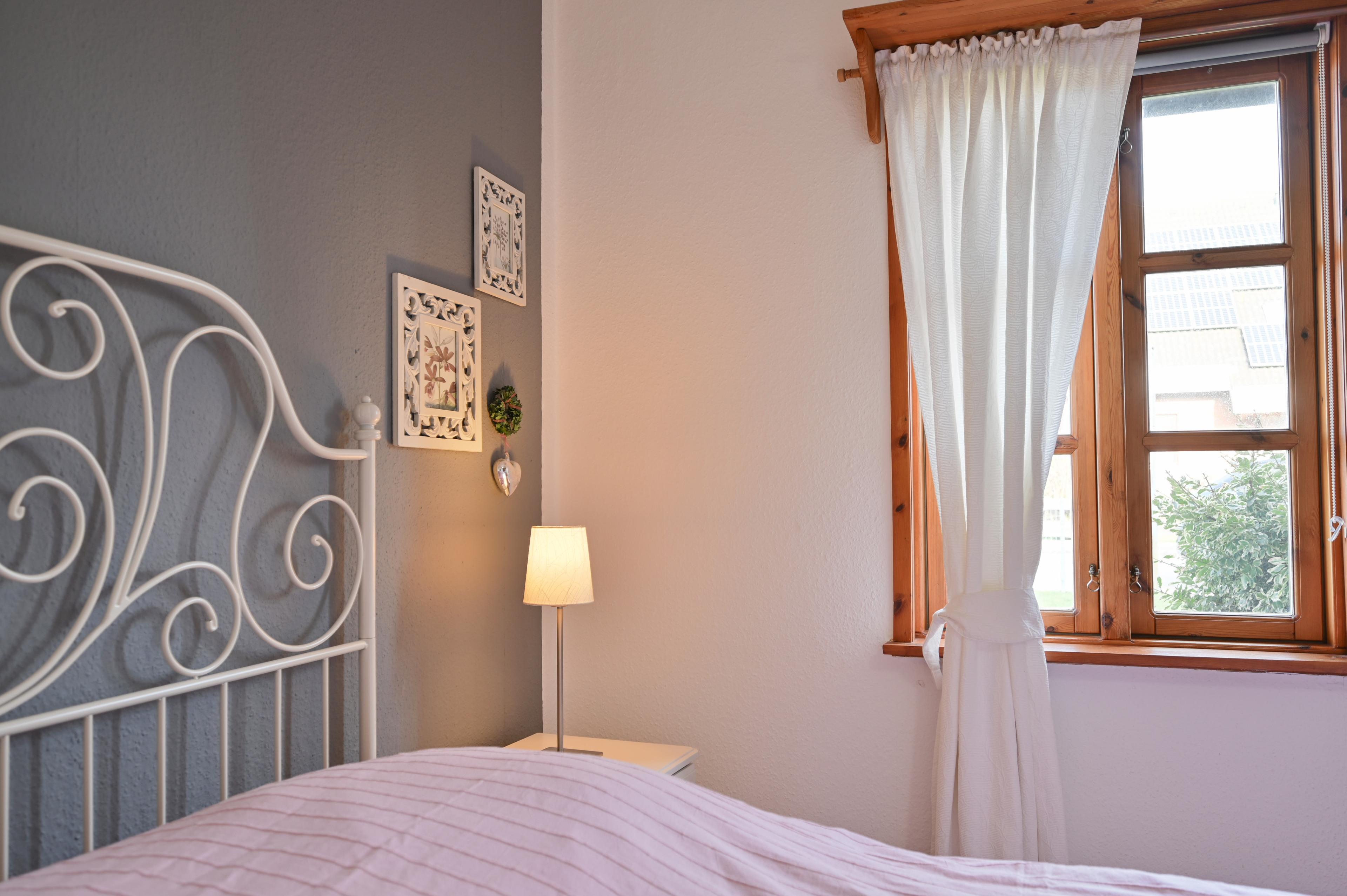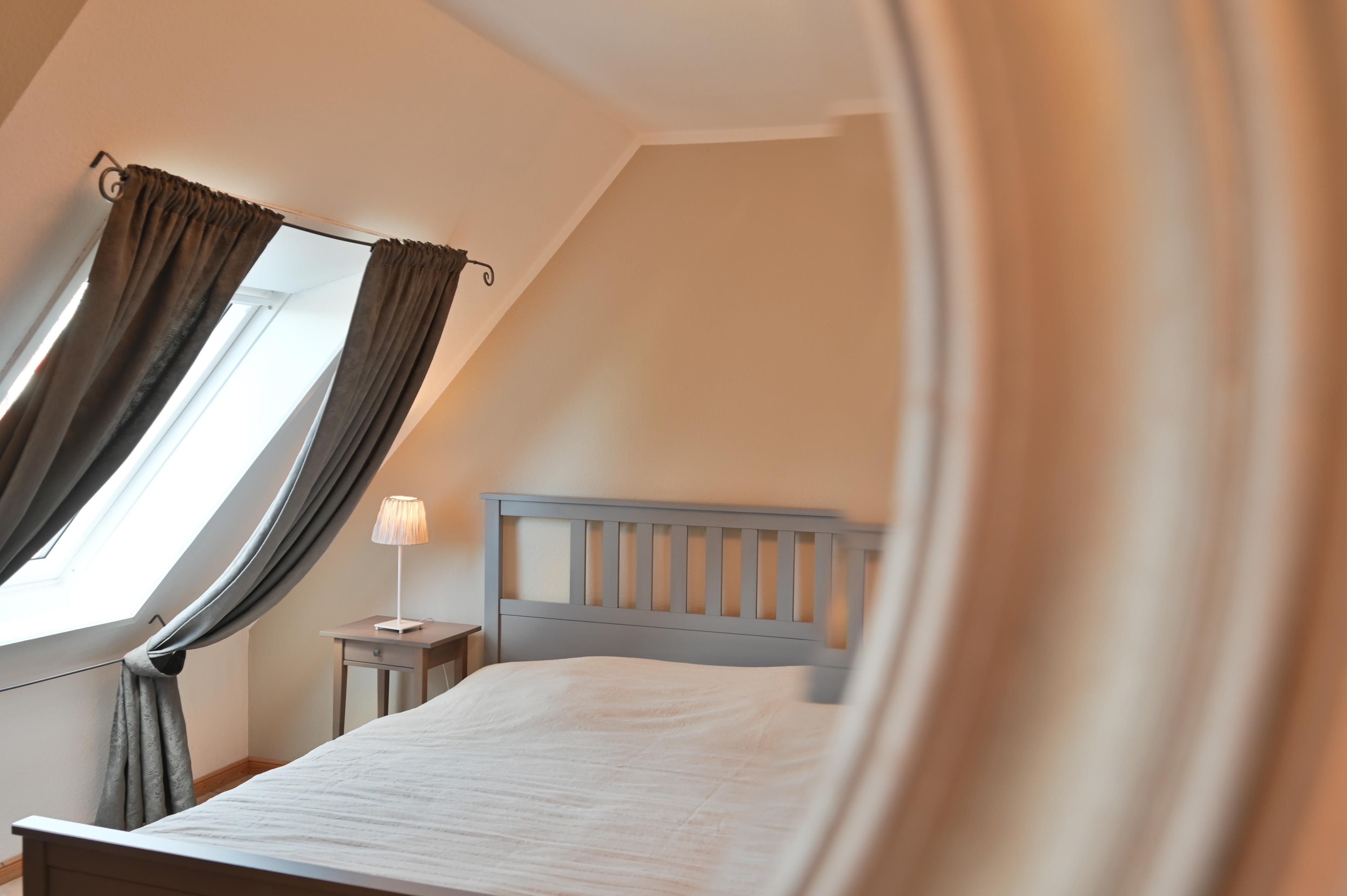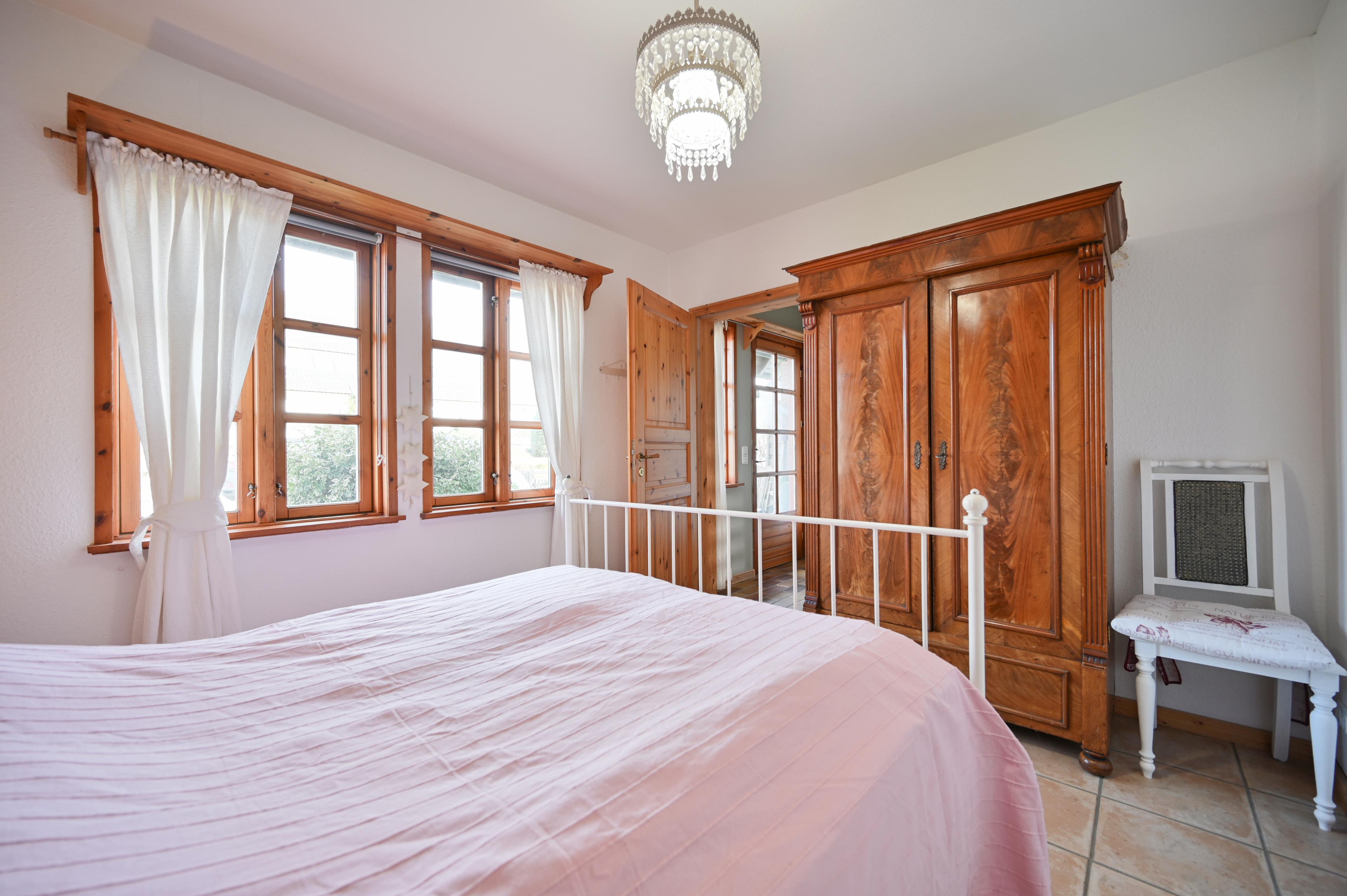Im separaten Schlafzimmer mit Doppelbett (140 x 200 cm durchgehende Matratze), Kleiderschrank, Nachttisch und Leselampe.