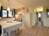 Die Ferienwohnung besteht aus einem Wohnzimmer mit komplett eingerichteter Küchenzeile und Essecke, bestehend aus einem Esstisch mit 4 dazu gehörenden Stühlen, einer Vitrine für Gläser und Geschirr, zwei 2-Sitzer Leder-Couchen, einem Lederhocker und einem Beistelltisch.