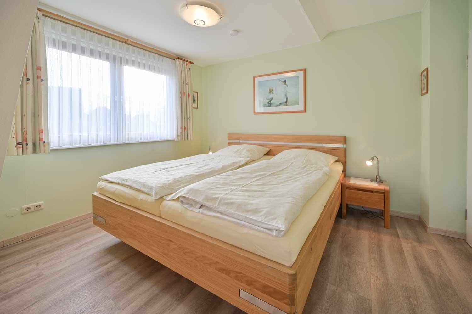 Darüber hinaus verfügt die Ferienwohnung über ein separates, komplett eingerichtetes Schlafzimmer mit Doppelbett, 2 Nachttischen und einem Kleiderschrank.