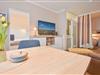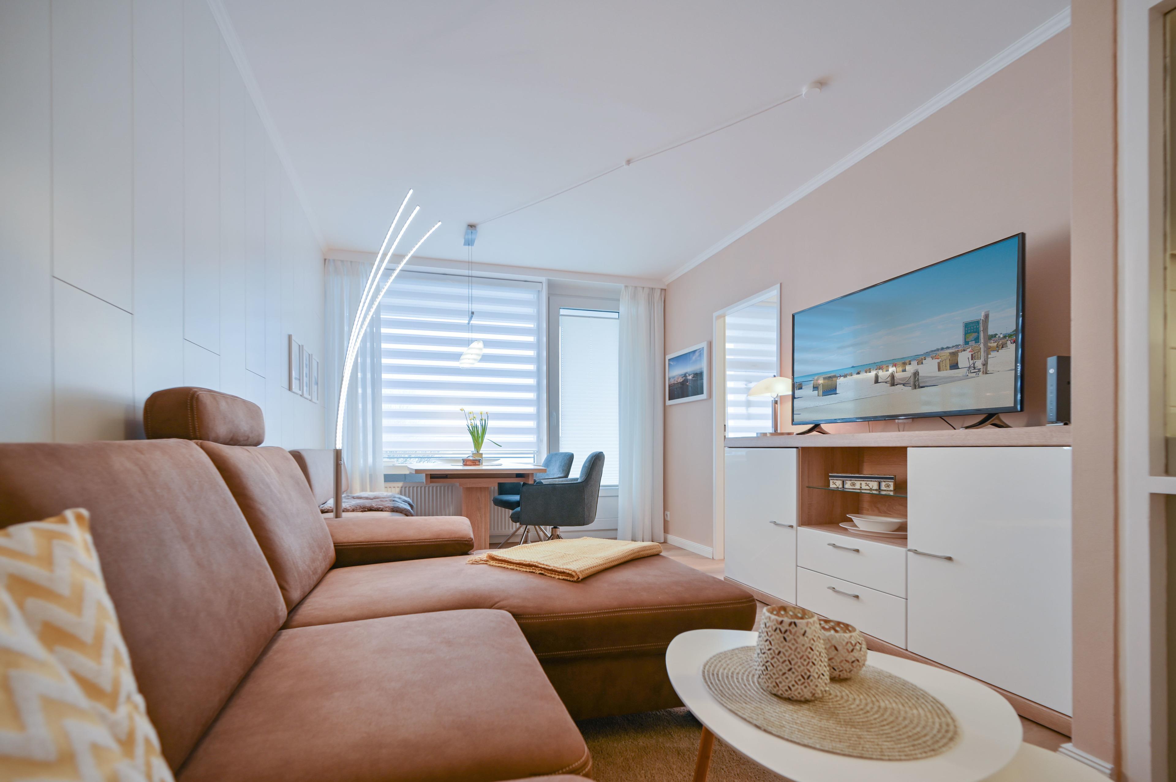 Der offene Wohnbereich bietet ein komfortables Doppelbett sowie ein gemütliches Sofa mit Ottomane zum Entspannen. Ein 50 - Zoll - Flachbild - TV sogt für gemütliche Filmabende.