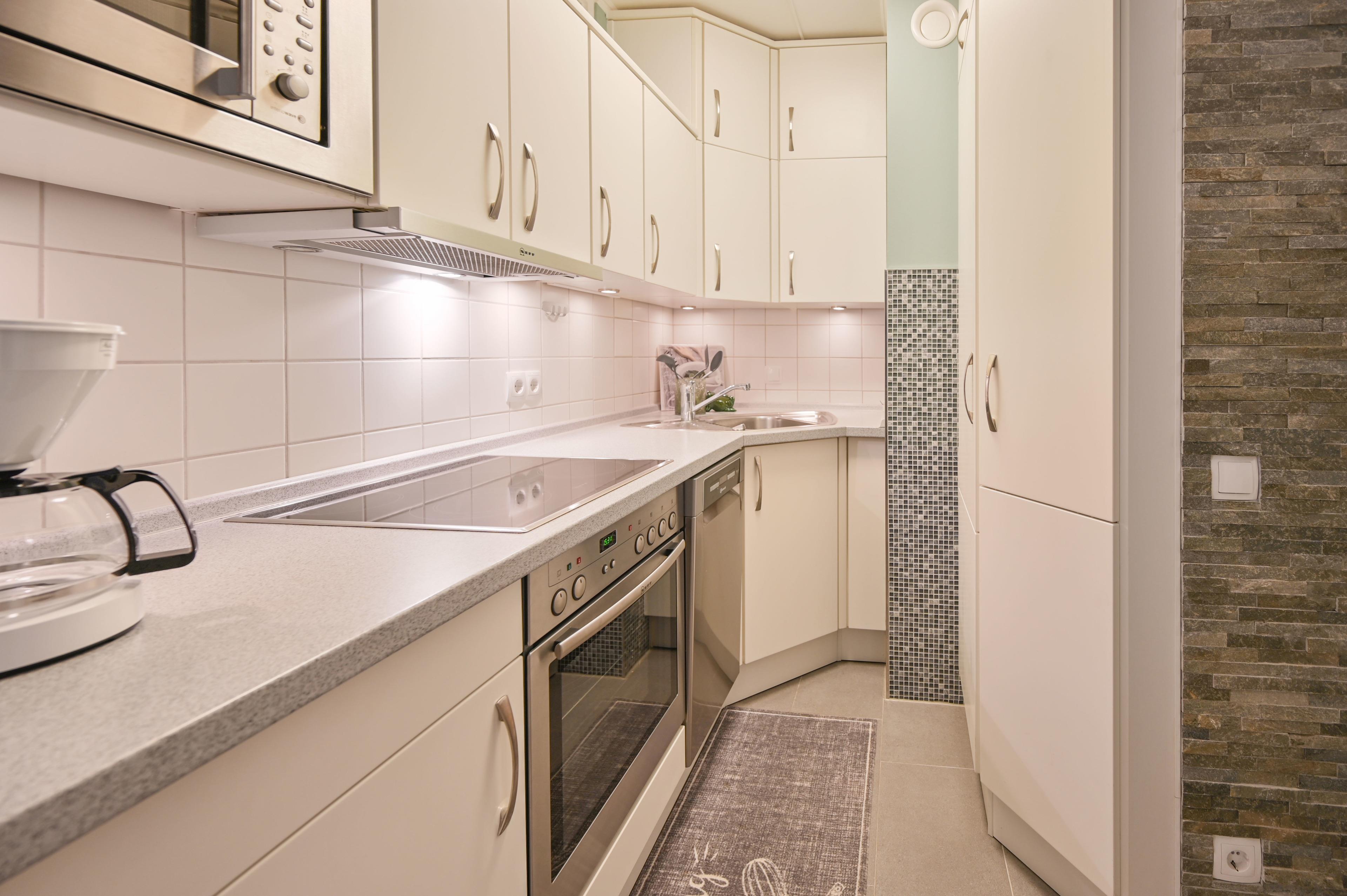 In der hochwertigen Einbauküche mit Cerankochfeld, Backofen, Spülmaschine und Mikrowelle fehlt es an nichts. Vom Kühlschrank mit Gefrierefach über die Kaffeemaschine bis zum Eier - und Wasserkocher ist alles vorhanden.