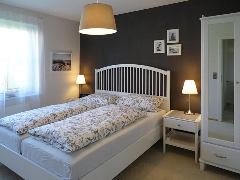 Das große Schlafzimmer ist mit Doppelbett, Nachttischen mit Leseleuchten, TV und Kleiderschrank ausgestattet.