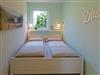 Das kleine Schlafzimmer ist mit Doppelbett, Kleiderschrank, einem Nachttisch und Leseleuchten eingerichtet.