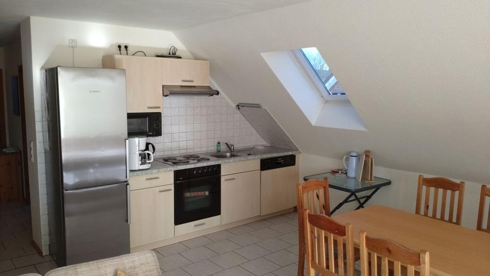 Die Fewo verfügt über einen Wohn-Essbereich mit Küchenzeile, 3er Couch, 2er Couch, 1er Couch, Couchtisch und Essplatz der für 6 Personen ausgelegt ist.