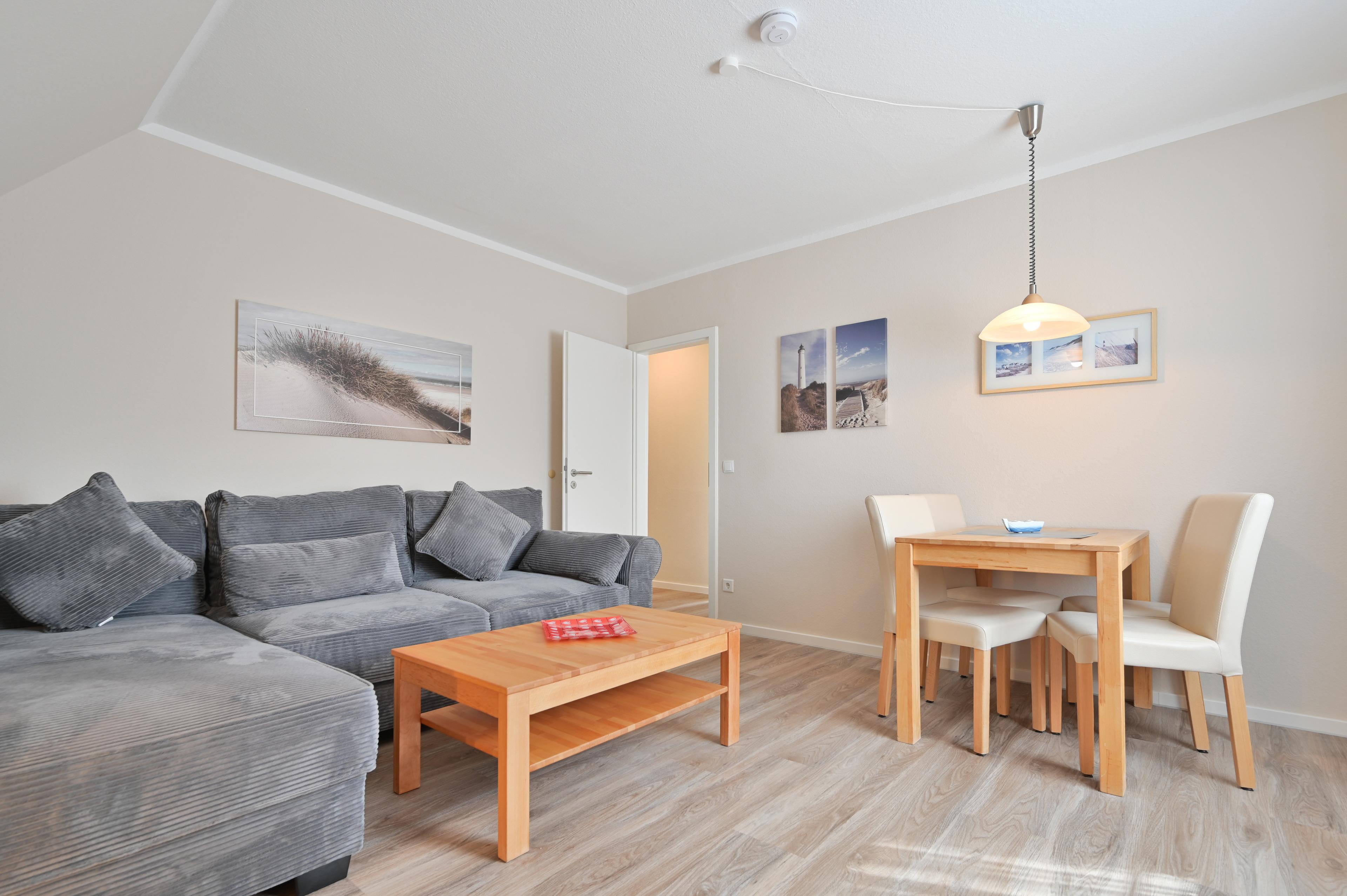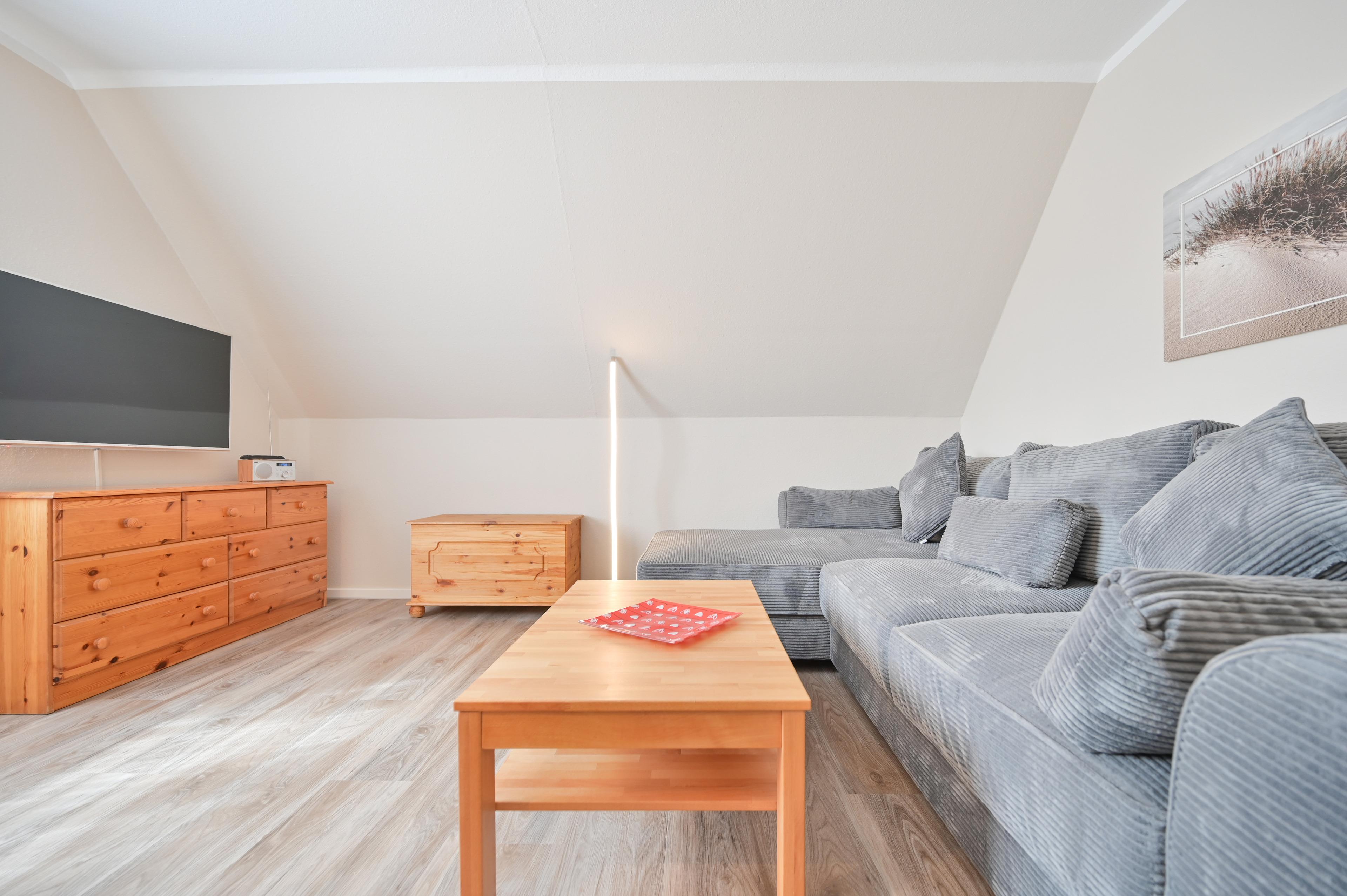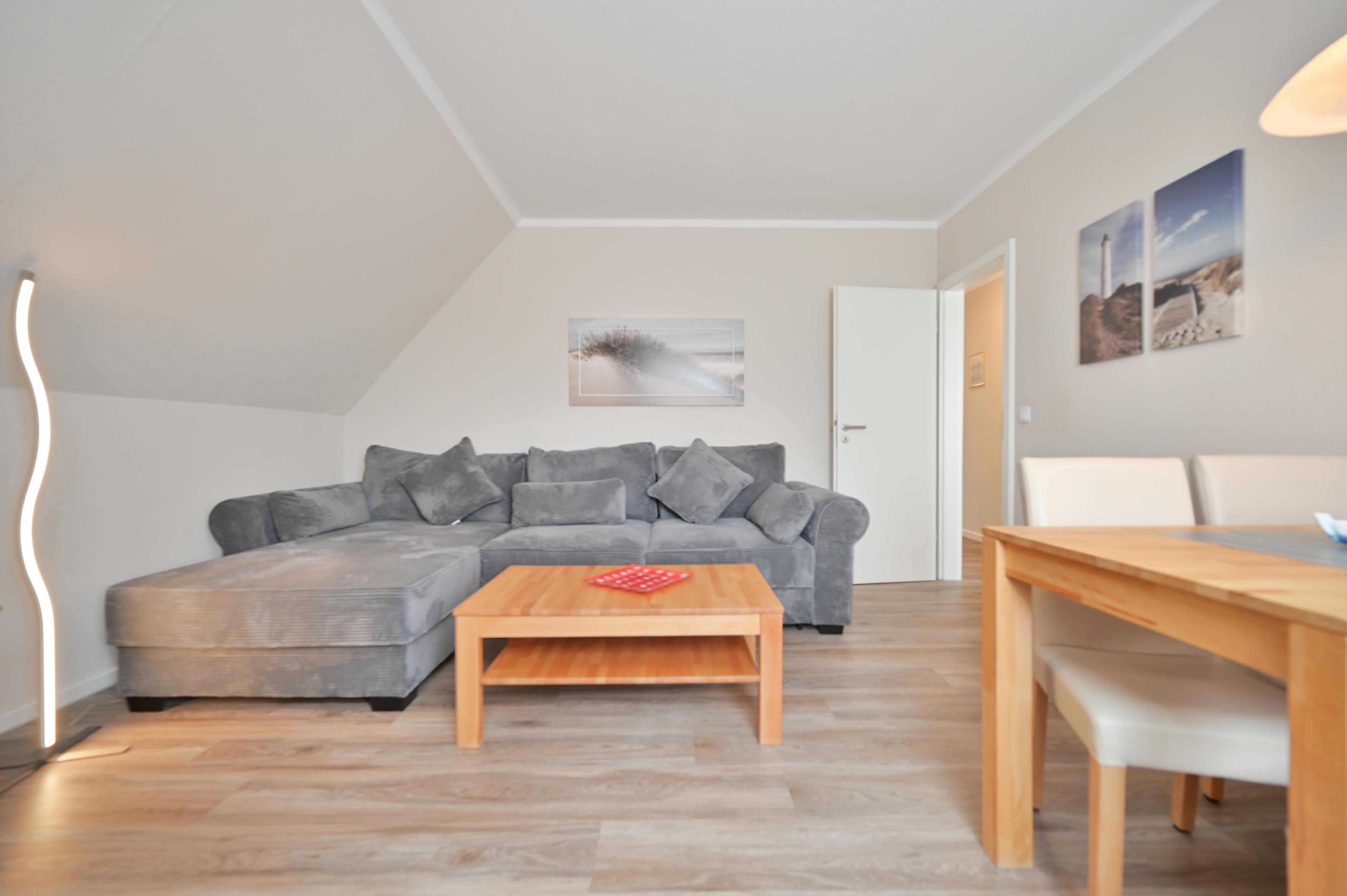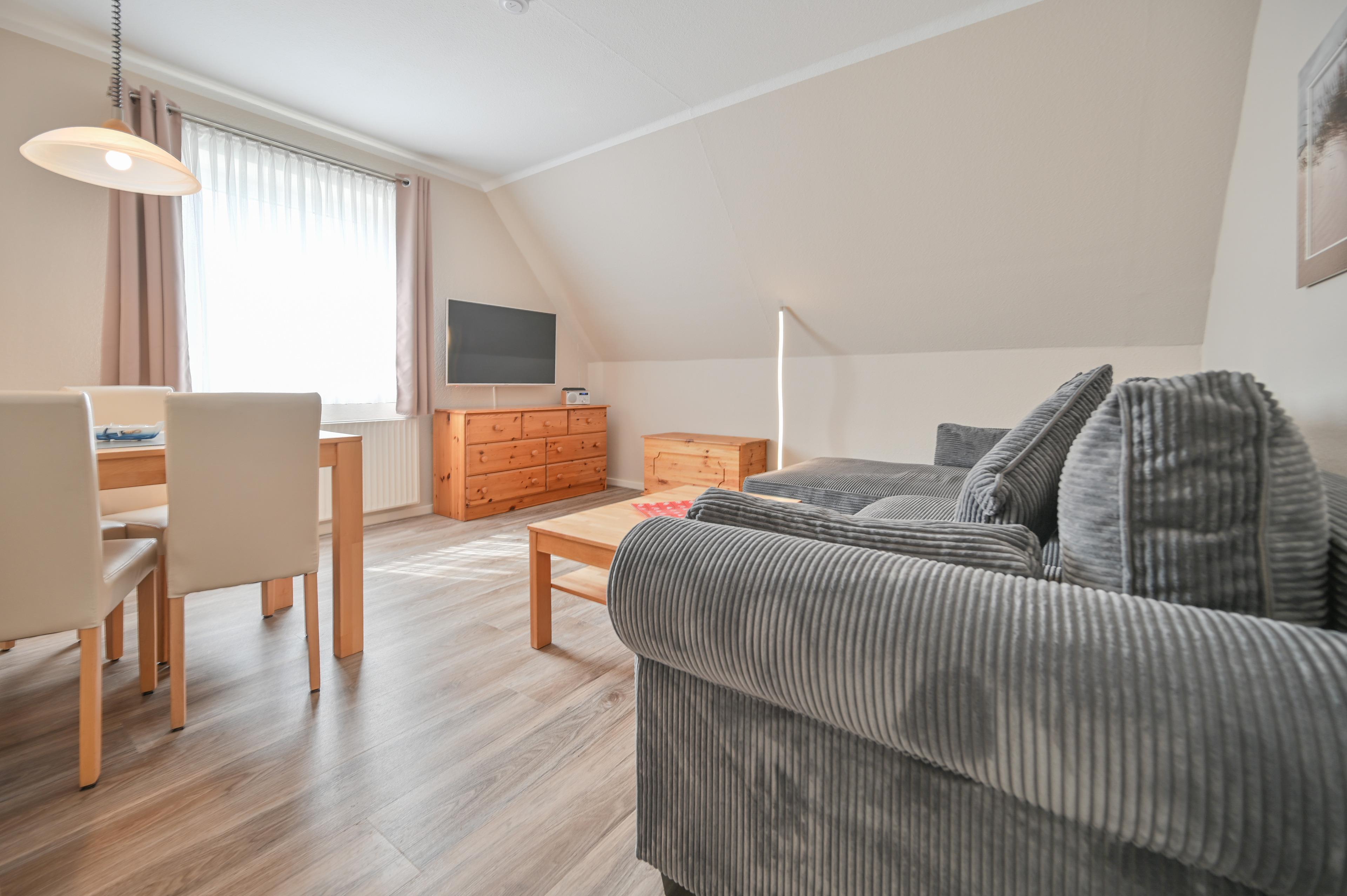 Das Wohnzimmer ist mit einem großen, bequemen Ecksofa mit Recamiere und Schlaffunktion, Sideboard, großem Smart-TV und einem Essbereich mit 4 Stühlen eingerichtet.