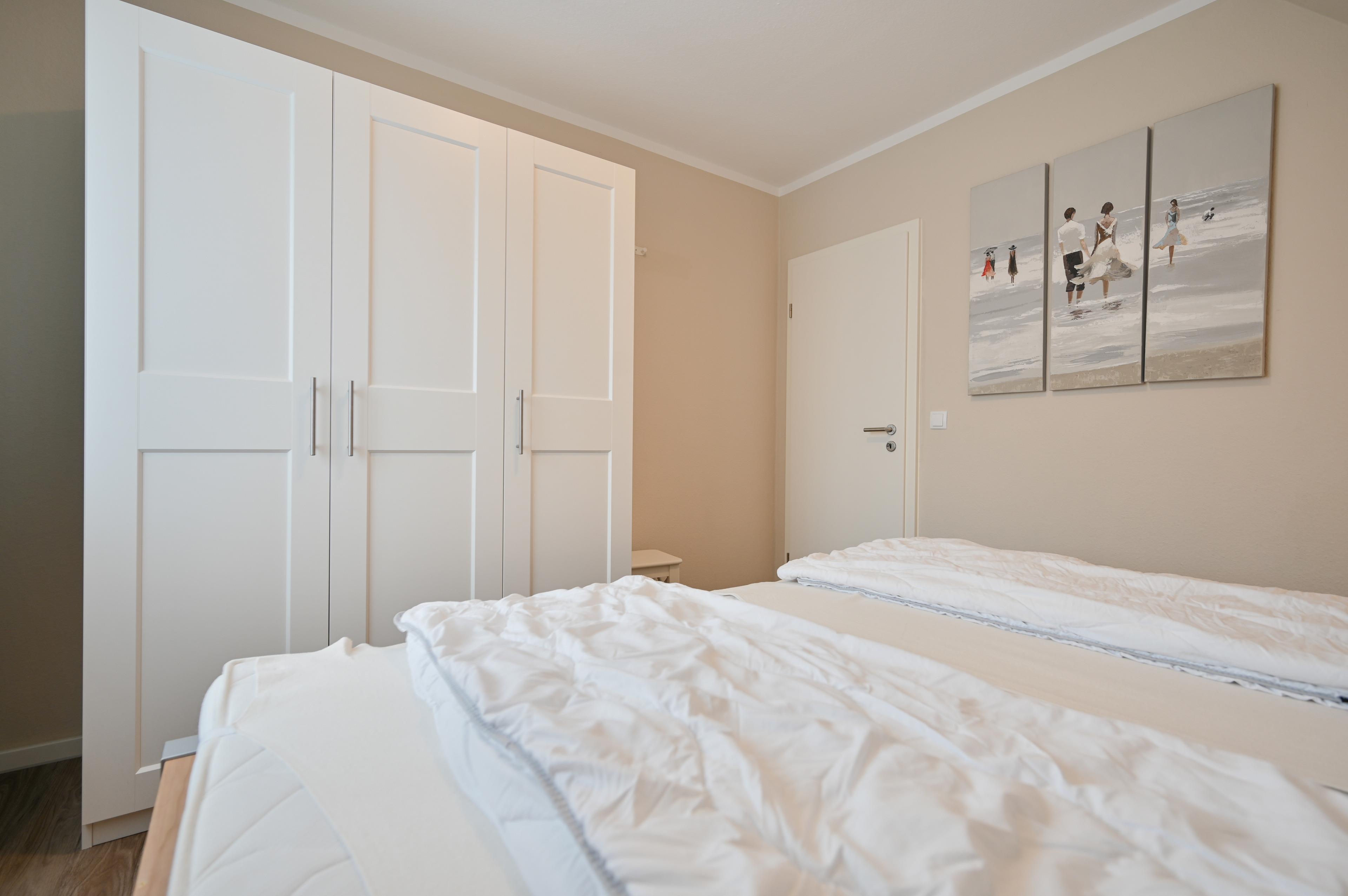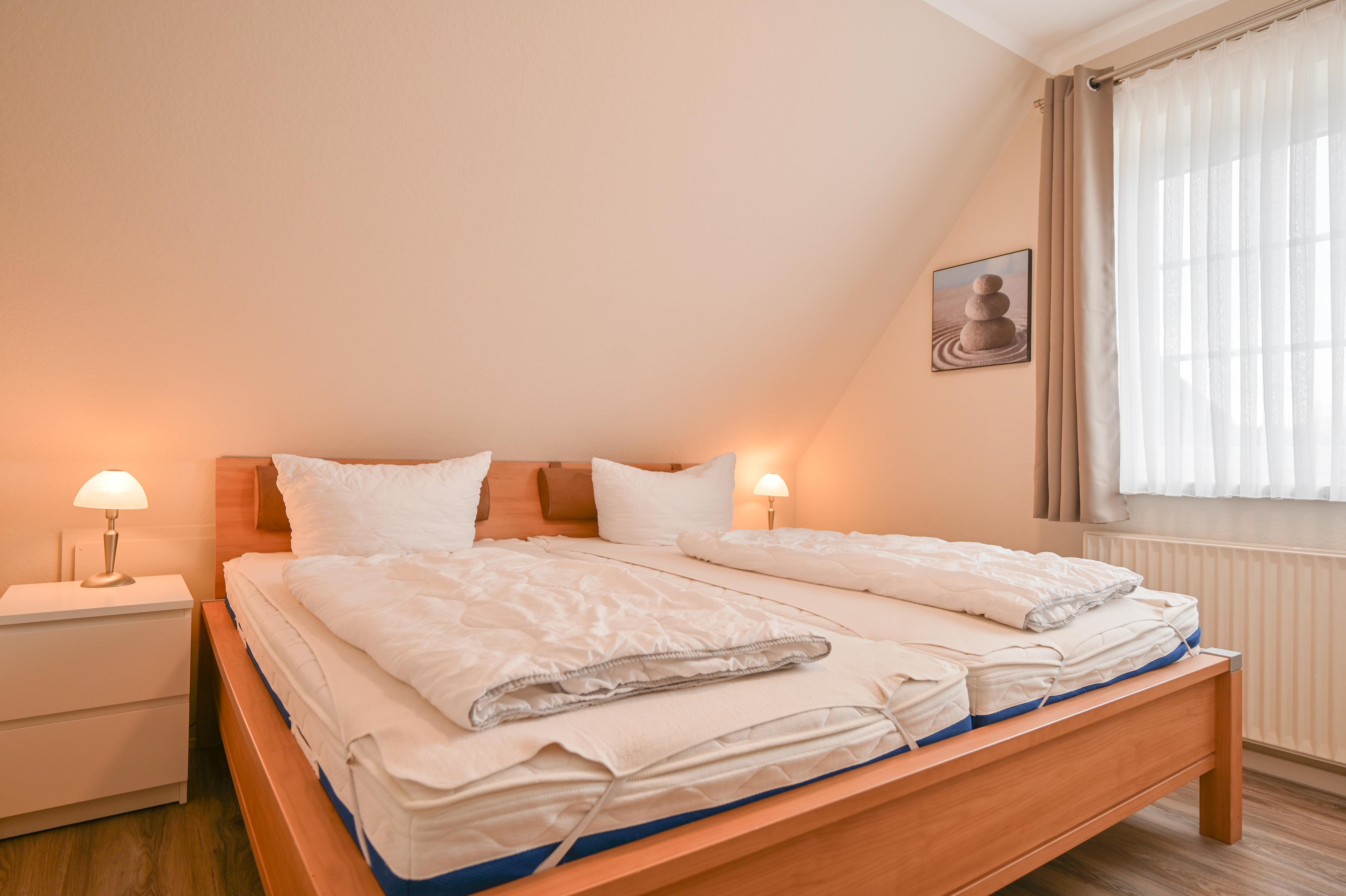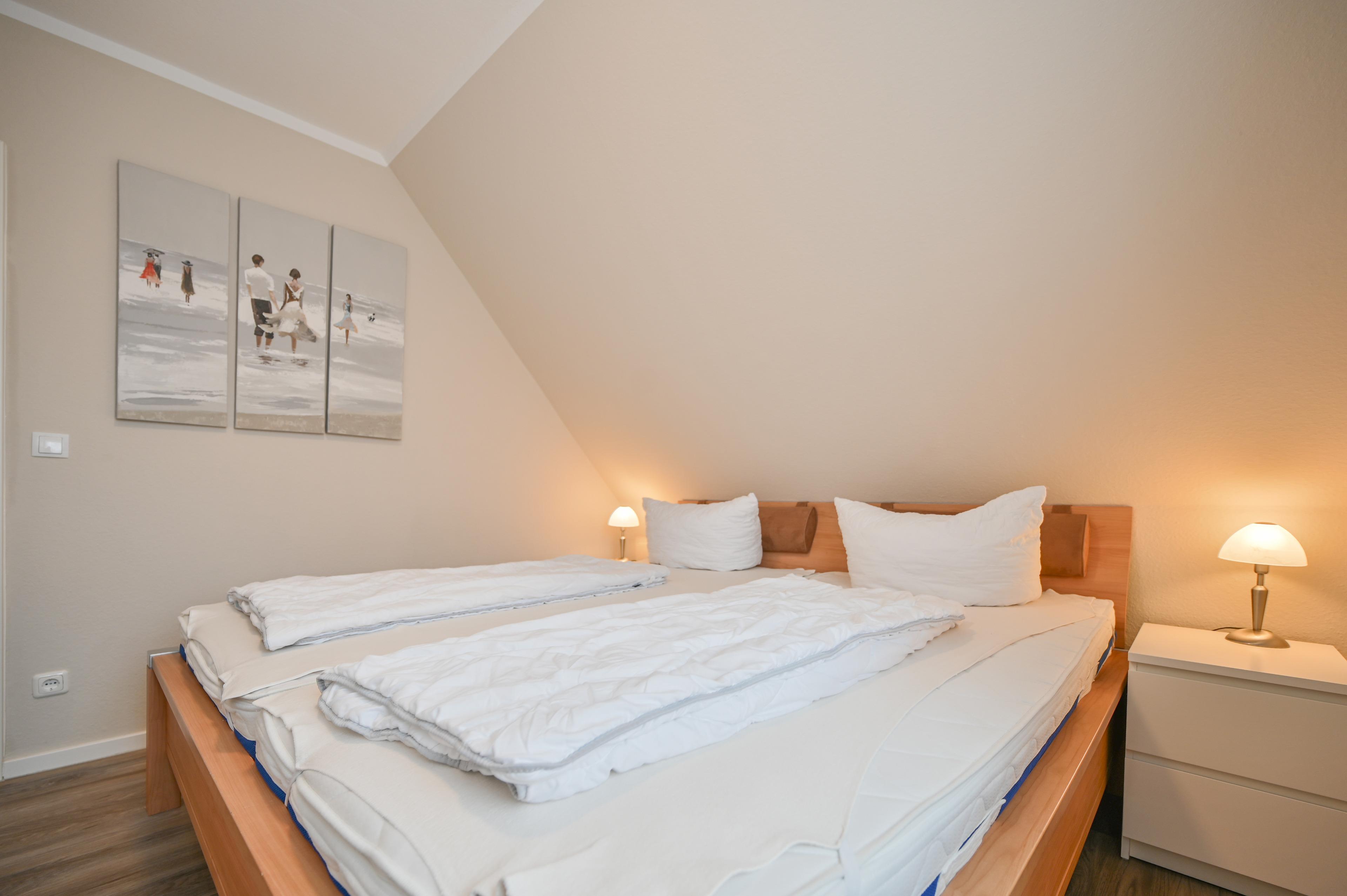 Im Schlafzimmer befindet sich ein Doppelbett (200x200 cm), zwei Nachtschränkchen mit Lesebeleuchtung und ein Kleiderschrank.