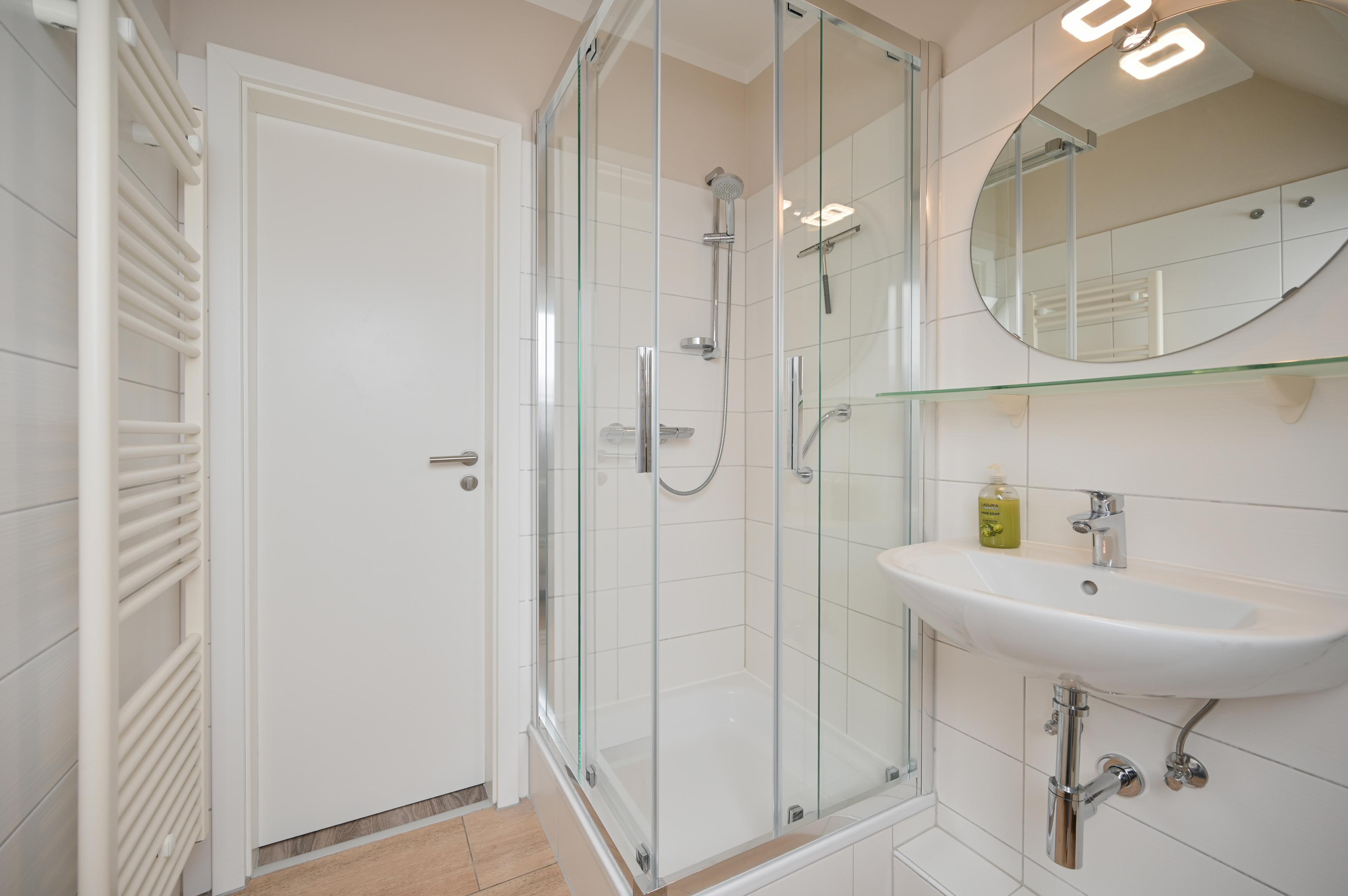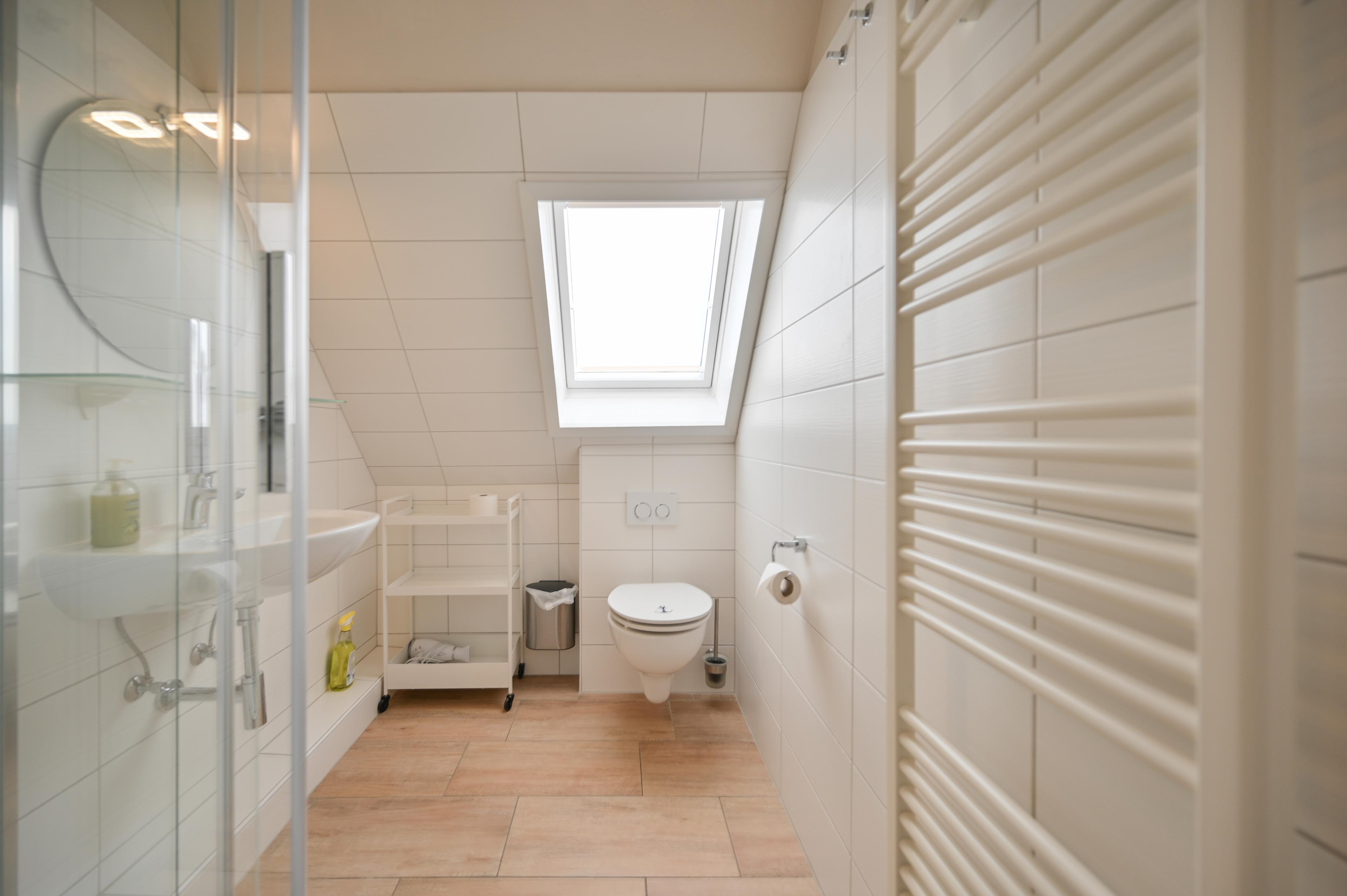 Das Badezimmer ist mit Dusche, WC und einem Waschbecken ausgestattet und hat ein Außenfenster.