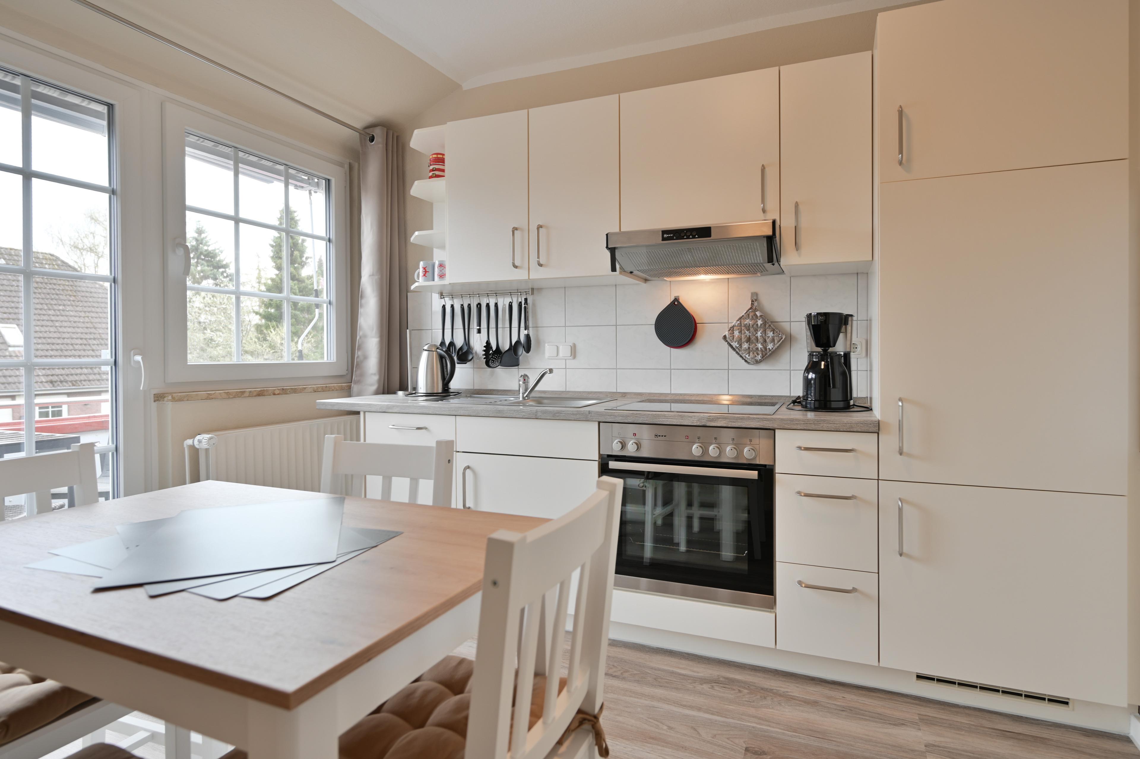 Die separate Küche ist mit einer modernen Küchenzeile und einem Tisch mit 4 Stühlen ausgestattet. Ein offener Abstellraum ist integriert.