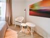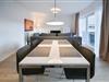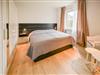 Das große separate Schlafzimmer verfügt über ein Doppelbett mit zwei Matratzen, Ablagen und Leseleuchten, einen großen Kleiderschrank sowie eine Sitzsecke mit Couchttischchen.
