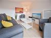 Der Wohn-Schlafraum der Fewo ist mit einer schönen Schlafcouch, 2 Sesseln, TV-Möbel mit Flachbild-TV und einer integrierten Küchenzeile. Der Essbereich ist für 4 Personen ausgelegt.