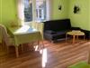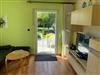 Vom großem Wohnzimmer aus haben Sie Zugang und Blick zur Terrasse und zum Garten. Es ist mit einer gemütlichen Couchgarnitur, einem Sideboard mit großem Flachbild-TV und einem Essbereich eingerichtet. Dieses Zimmer verfügt darüber hinaus über eine angenehme Fußbodenheizung.