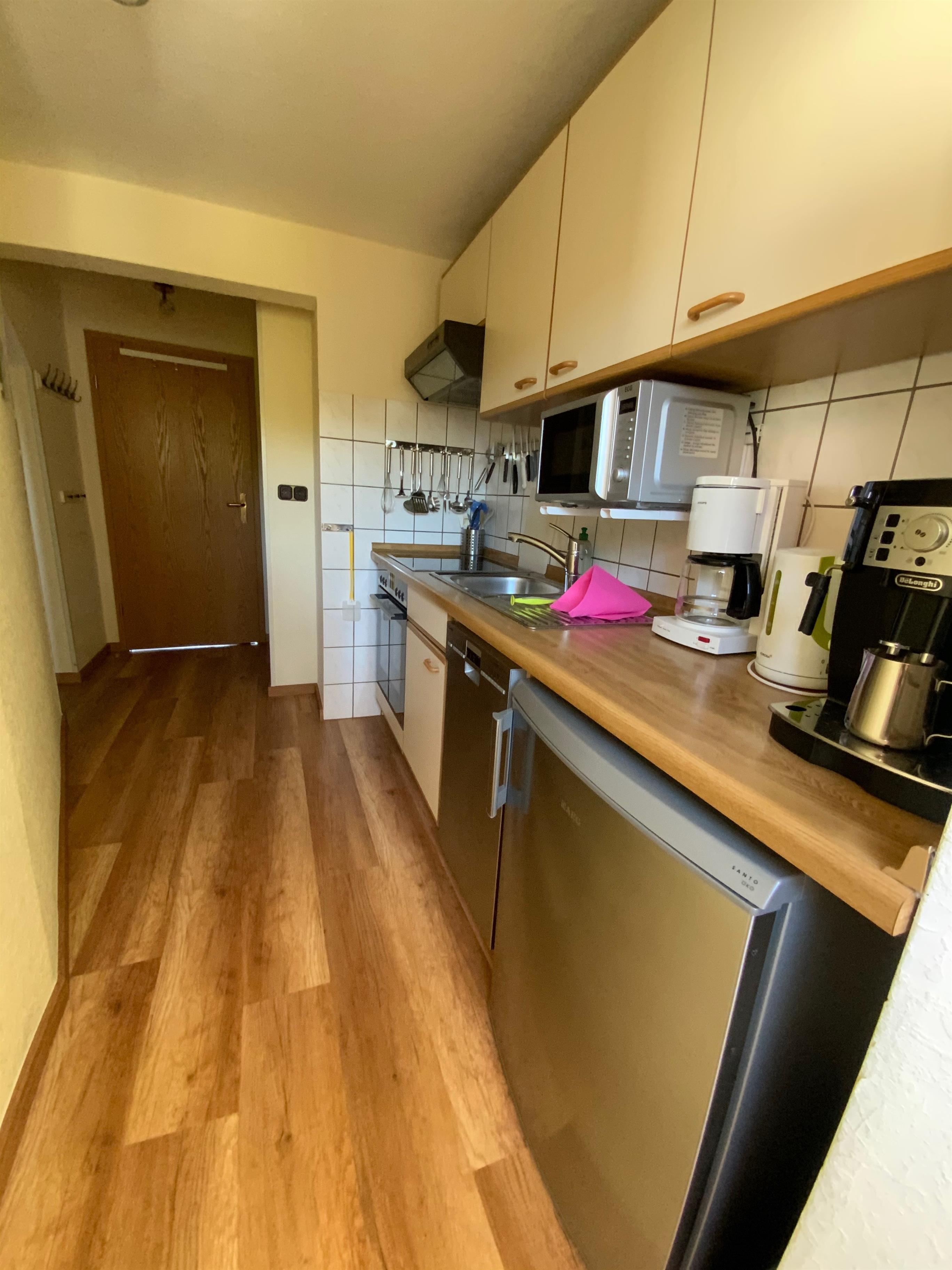Die Küchenzeile verfügt über einen Kühlschrank mit drei Sterne Kühlfach, einen Geschirrspüler, eine Mikrowelle, Kaffeemaschine und einen Kaffeevollautomaten sowie einen neuen und hochwertigen Induktionsherd mit Umluftbackofen und bietet genügend Platz zum Kochen.