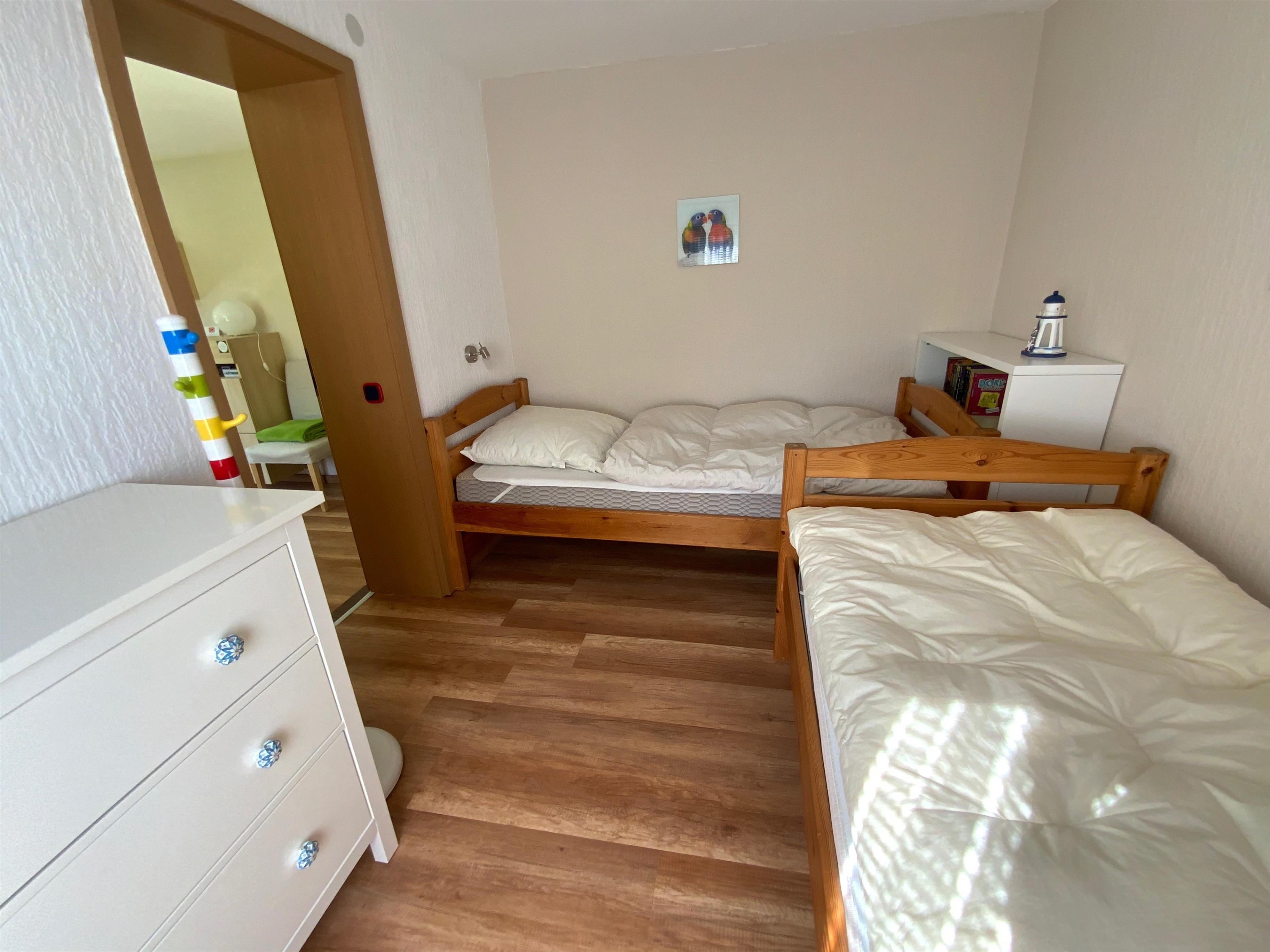 Im Kinderschlafzimmer befinden sich zwei einzelstehende normal große Betten sowie eine Kommode.