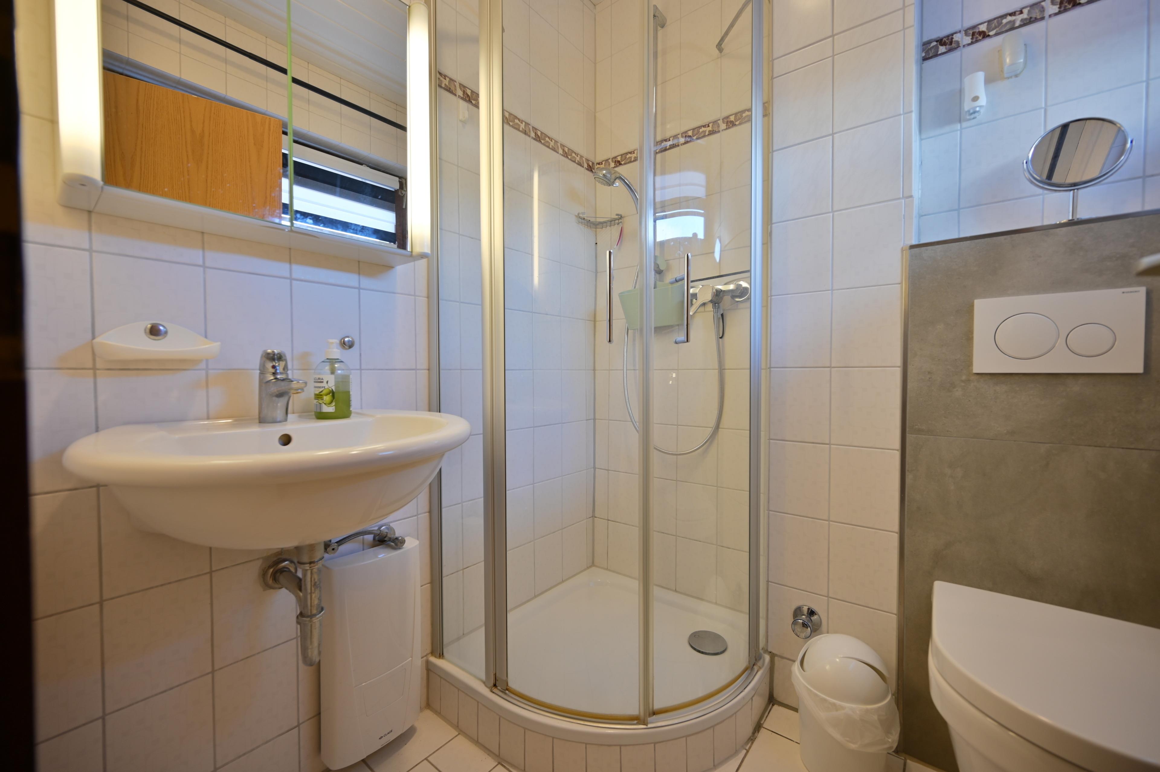 Ein Badezimmer mit Dusche/WC ist vorhanden.