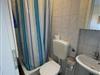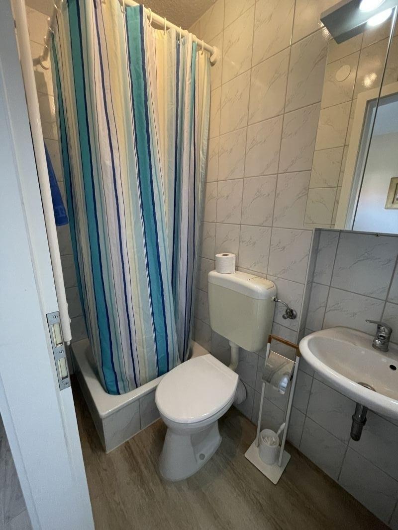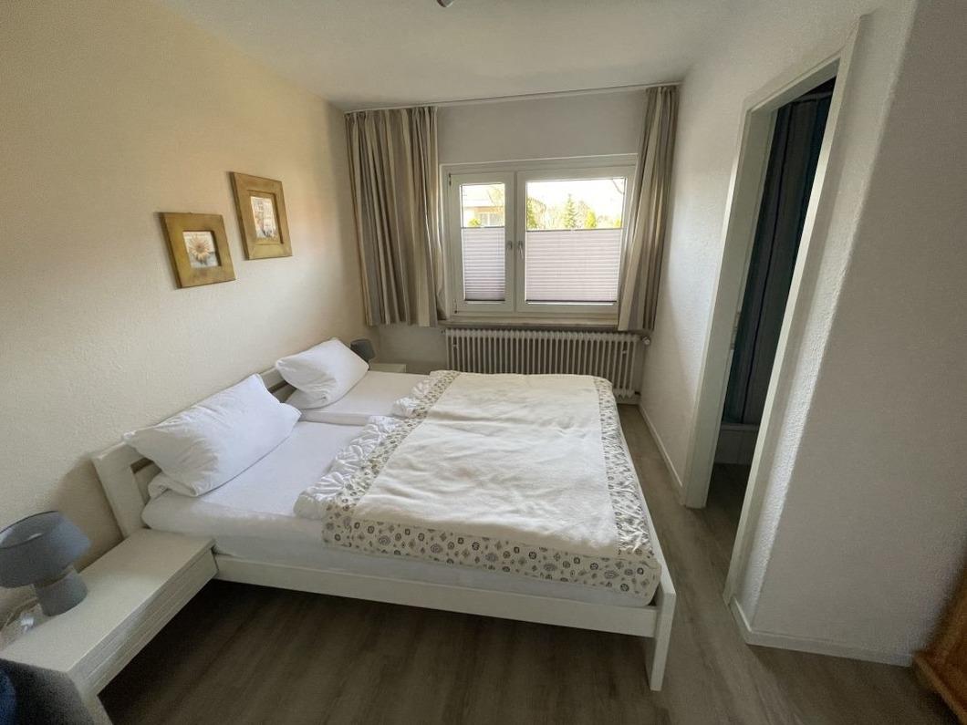 Am Schlafzimmer mit Doppelbett liegt das kleine Bad mit Dusche.
