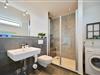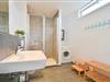 Badezimmer mit Dusche, Waschbecken, WC und Waschmaschine.