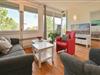 Der helle Wohnbereich ist mit einer gemütlichen Couch, einem Sessel, Couchtisch, TV-Möbel mit Flachbild-TV und einer Vitrine ausgestattet. Von hier aus haben Sie Zugang zum Balkon, der in Richtung Ostsee zeigt.